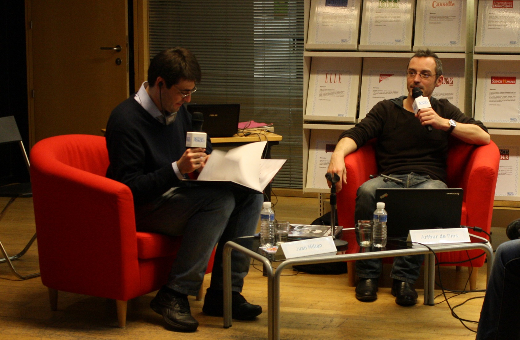 Pecados veniales, La marcha del cangrejo y Zombillenium. Diversión asegurada en tres títulos muy diferentes, todos obra de Arthur de Pins. El autor francés ha estado en Madrid coincidiendo con Expocómic y traído a España por Dibbuks, la editorial que publica su obra en nuestro país. Y desde esa misma editorial nos propusieron moderar el único acto de De Pins de carácter gratuito de esta visita, lo que Cómic para todos entiende como un pasito más en el reconocimiento al trabajo que hacemos en este modesto espacio, por lo que procede dar las gracias a toda la gente de esa espléndida editorial, que además de un magnífico catálogo con el que disfrutar (¿que aún no sabéis qué publican? Aquí podéis ver lo que hemos publicado sobre ellos) tiene una calidad humana impresionante. La presentación tuvo lugar el pasado viernes día 13 de diciembre en el Institut Français de Madrid, que puso todas las facilidad para que el acto fuera aún más interesante. Hubo una espléndida traducción simultánea que hizo que las explicaciones de De Pins, por supuesto en francés, y la moderación y algunas de las preguntas del público, en español, pudieran ser entendidas por todos. De esta forma, los casi 90 minutos que duró el acto quedaron muy bien aprovechados, en los que De Pins pudo explayarse a gusto para explicar su asombrosa y minuciosa técnica de dibujo y los presentes pudiéramos satisfacer nuestras dudas sobre su obra.
