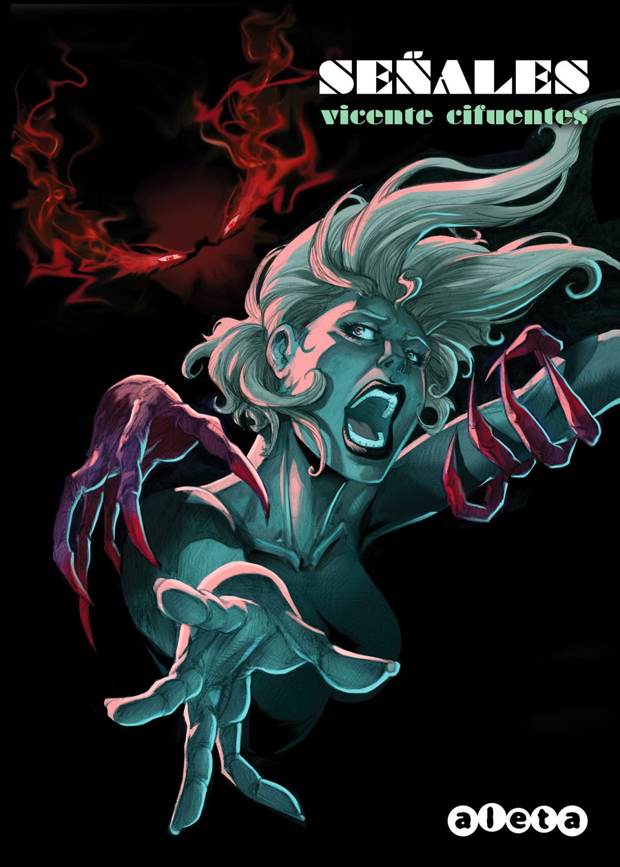 Hay cómics que se graban a fuego en el subconsciente del lector ya desde su ilustración de cubierta. Señales es uno de ellos. Vicente Cifuentes resume lo que va a ofrecer durante las siguientes 200 páginas con una perfección extraordinaria en esa ilustración. Una mujer en peligro, un ser sobrenatural acechante, luz y oscuridad contrapuestas, un misterio complejo y una enorme empatía por la protagonista, todo ello mostrado en realidad sin desvelar absolutamente nada sobre el contenido de la obra. Todo eso está en una sola ilustración, la hipnótica y formidable imagen que Cifuentes ha escogido para atrapar al lector con la misma fuerza que ese ser oscuro agarra el cuerpo aparentemente desnudo de la mujer que ocupa su centro. La sorpresa, no por la conocida categoría del autor sino por la ingente cantidad de portadas que apuntan algo que después no llega, es que esas 200 páginas que vienen a continuación están a la altura de lo prometido. Es una historia de misterio sobrenatural que engancha con una facilidad impresionante, con una imaginación desbordante y una ejecución sobresaliente que convierte en una misión imposible la de abandonar el libro antes de llegar al final.