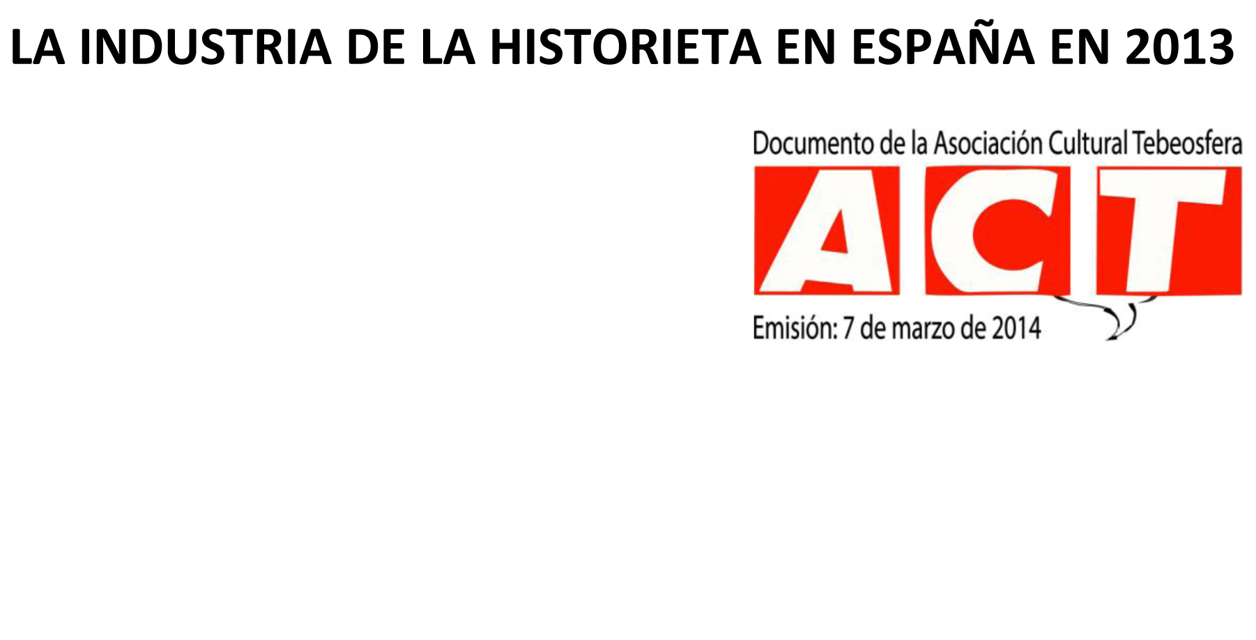 Tebeosfera ha hecho público un completísimo informe titulado La industria de la historieta en España en 2013 que traza una precisa radiografía del sector del cómic en nuestro país. Y los datos de la asociación cultural, a pesar de la situación de crisis general que vive España y las inalterables dificultades del sector editorial, son moderamente optimistas. Con respecto a 2012 ha aumentado el número de publicaciones en todos los ámbitos. Los tebeos comerciales e institucionales han pasado de 2.233 a 2.277; las publicaciones con historietas, de 81 a 95; las antologías satíricas, de 24 a 28; y los fanzines, de 25 a 53. «El número de tebeos que vieron la luz en 2013 se mantuvo a un nivel parecido al de otros años, al menos desde que el mercado se estabilizó (a partir de 2009) en el intervalo 2.350 a 2.400 lanzamientos por año», explica el informe.