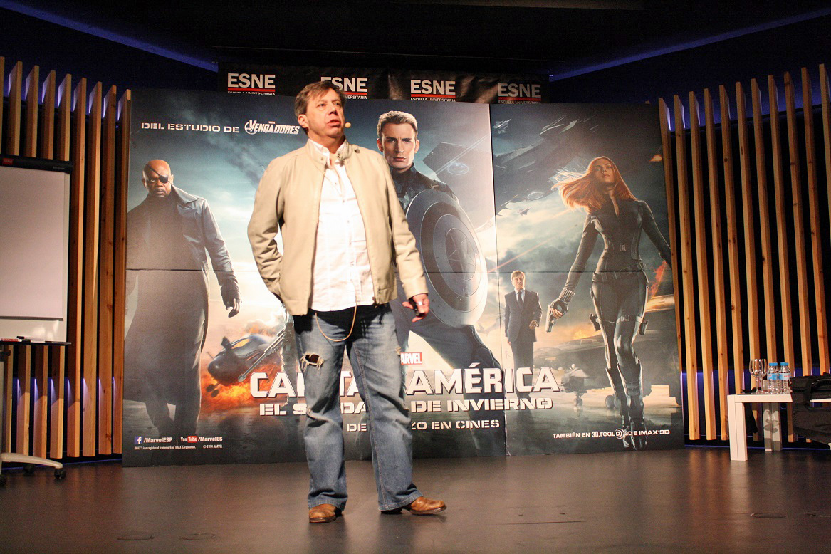 El pasado viernes día 14 de marzo, Carlos Pacheco ofreció una formidable masterclass en la Escuela Universitaria de Diseño, Innovación y Tecnología de Madrid. El acto fue parte de la promoción de Capitán América. El Soldado de Invierno, la película que se estrena el próximo día 28 («una de las pocas películas de superhéroes que tengo ganas de ver»), pero acabó siendo un magnífico repaso por la historia del personaje, por el trabajo que el propio Pacheco está haciendo ahora mismo en el cómic del Capi, por el mundo del cómic en general y por su relación con las películas basadas en personajes de las viñetas que en los últimos han proliferado sin medida. Pacheco arrancó su masterclass haciendo un repaso histórico por la vida del Capitán América, destacando que fue creado por Joe Simon y Jack Kirby, recuperado para la nueva Marvel de los años 60 por Stan Lee y el propio Kirby, destacado por Jim Steranko, «el dibujante pop por excelencia de aquella época», engrandecido por el guionista Steve Englehart y reimaginado en los Ultimates por Mark Millar, «un señor que está como una cabra» y que se olvidó «de ese lado superheroico tradicional, de vigilante, y transforma a los superhéroes en militares».