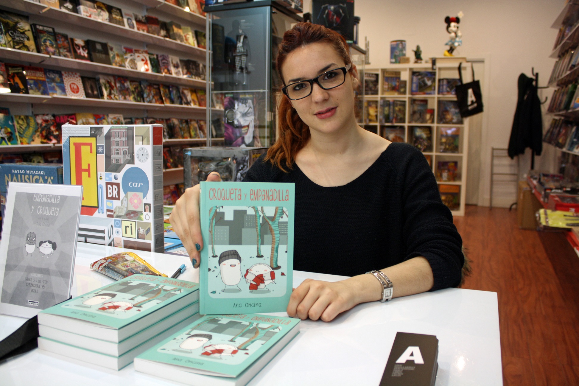 El pasado día 5 de abril Ana Oncina estuvo en Madrid, en Atom Cómics, para firmar su primer trabajo, Croqueta y Empanadilla, editado por La Cúpula (aquí, su reseña). Y aunque ya habíamos contactado con ella para hacer esta entrevista por mail, aprovechamos la ocasión yallí que nos fuimos para charlar en persona con esta encantadora y versátil autora que tan fácilmente parece haber capturado la esencia de la vida en pareja con estos dos personajes con forma de alimento y que, en realidad, en muchas cosas son ella misma y su novio. Eso es lo que nos explica en esta entrevista, cómo nace este su primer cómic y cómo se ha convertido en realidad. Y después de leer lo que nos cuenta, ¿a que tenéis ganas tanto de leer Croqueta y Empanadilla como de ver ese corto de animación que está preparando…?