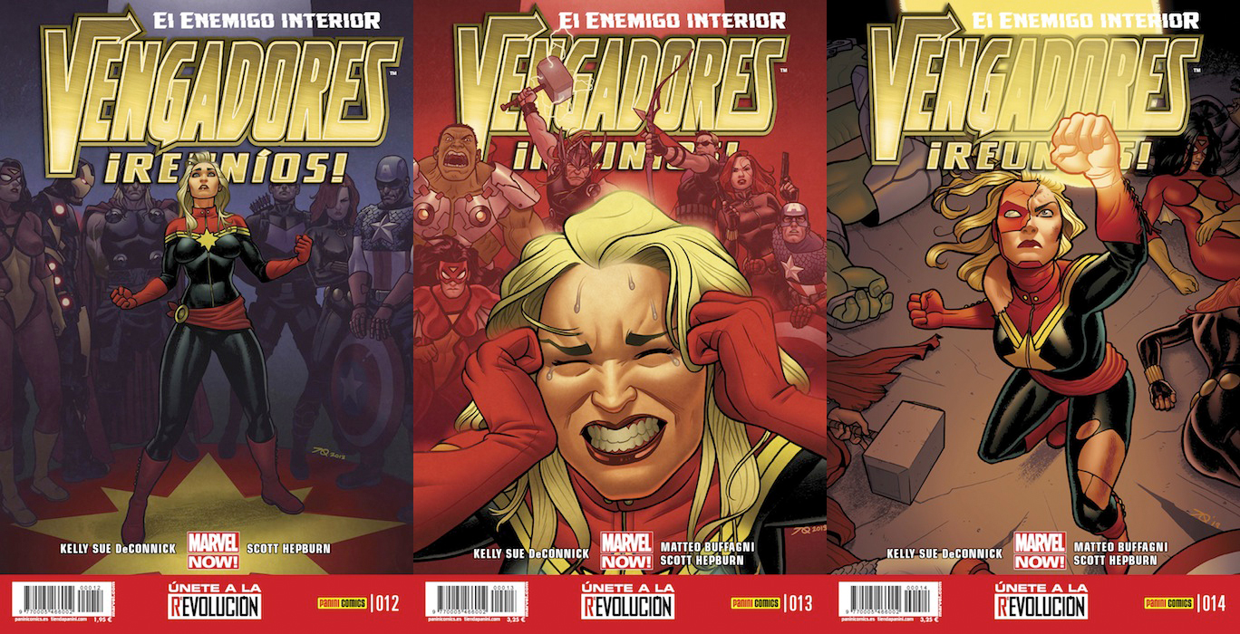 La versión de Carol Danvers que Kelly Sue De Connick ha ido construyendo durante meses llega a su primer gran punto culminante en El enemigo interior, un arco argumental que se desarrollo en la serie de la Capitana Marvel y en la de los Vengadores, dándole una dimensión mayor (y de paso cumpliendo con una clara estrategia de márketing para hacer que las maltrechas ventas de Capitana Marvel crecieron algo más). Convence la explicación a los males de Carol que ha venido mostrando en los volúmenes precedentes (aquí la reseña del primero y aquí la del segundo) y termina de completar el espléndido retrato de la Capitana Marvel como heroína, aunque con un detalle ingenuo que ayuda a resolver la trama y que genera cierta incredulidad. Pero aún así, y aunque el dibujo no termina de llegar a la misma altura de lo que habían mostrado en los números precedentes sobre todo Dexter Soy y Emma Ríos pero también Christopher Sebela, el resultado sigue siendo más que satisfactorio. Puede que decirlo sea de alguna manera contribuir a esa arcaica concepción machista del cómic de superhéroes, pero leyendo El enemigo interior no cabe más que concluir que una mujer, una heroína, puede protagonizar esta clase de historias tan brillantemente como un hombre. Y por desgracia hay que recalcarlo.