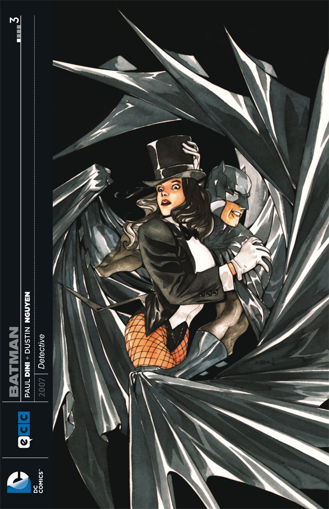 Dustin Nguyen, ilustrador de todos los números de esta entrega, tiene un estilo muy personal, que en un primer vistazo probablemente no gustará por igual a todos los aficionados. Eso sí, hay que reconocerle que crea un entorno visual que encaja como anillo al dedo en los guiones de Dini. Entiende su faceta más desenfadada y divertida, la espectacular y superheroica, y también la más dramática. Después de los dos volúmenes anteriores, en los que el ilustrador fue rotando bastante (con estilos tan dispares como los de J. H. Williams III o Andy Clarke), en este tercero de la serie Nguyen se convierte en tan protagonista como Dini, incluyendo su trabajo para una historia escrita por Peter Milligan de tono abiertamente más fantástico y que el ilustrador también realiza con mucho acierto. En realidad, Nguyen atrapa desde sus magníficas cubiertas, donde, con un acaba ligeramente diferente pero igualmente identificable, destaca incluso más que en las páginas interiores. Entre Dini y Nguyen firman una nueva y muy entretenida colección de historias de Batman que no tiene la necesidad de romper con nada ni cambiar sus mitos para encontrar un hueco elogiable en la leyenda de un personaje con tantas décadas de historia. Para disfrutar sin complejos.
