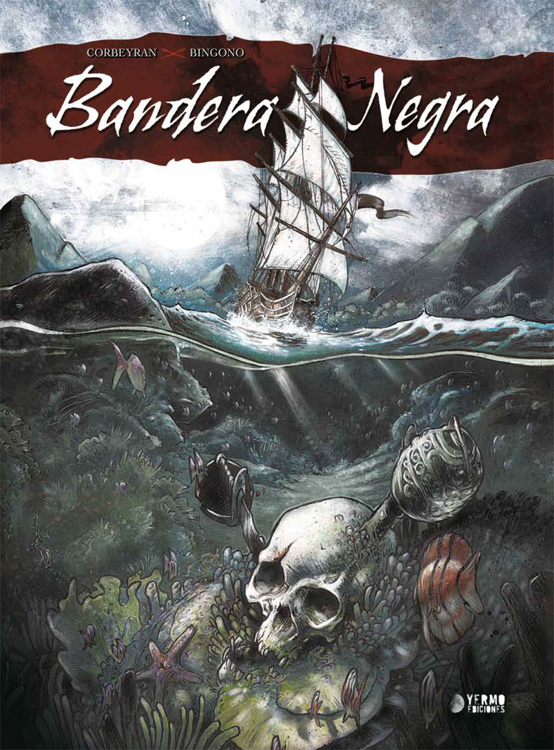 Pero volvamos por un momento a esas ocho primeras páginas. Si con esas pocas páginas Corbeyran ya ha hecho que nos enamoremos de los personajes y de la historia, lo mismo se puede decir del espléndido trabajo en las ilustraciones de Bingono, que consigue no sólo trazar un preciso retrato de sus protagonistas, divertido y pícaro, sino que además se sumerge en el género con total acierto. Aquí hay piratas, ese es el mensaje que trasladan esas páginas y que en de ahí en adelante se conjuga con el resto de pretensiones de la historia. Porque Bingono también domina los elementos más fantásticos y, sobre todo, una cuidada ambientación en lo que atañe a los elementos de la piratería pero también al misterio de corte fantásticos en que se desarrolla la historia. Eso sí, si hay que destacar algo de las ilustraciones es la acción. Con esas páginas, desde las primeras ya mencionadas hasta el formidable abordaje del tercer álbum plasmado en una magnífica splash page doble, Bingno hace que el lector respire una auténtica historia de piratas, y esa inmersión no tiene precio, sobre todo para los lectores más clásicos que lleven años sin disfrutar de verdad de un género aparcado pero no muerto. Bandera negra es una gran diversión que pide a gritos más aventuras. Esta es una historia cerrada, pero su final abierto hace que el deseo de más sea inevitable.
