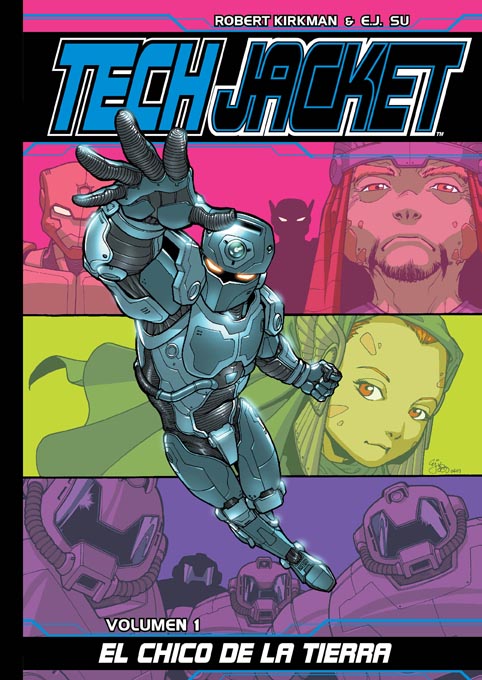 En 2003, Robert Kikrman firmó el primer número de las dos series que le convirtieron en uno de los autores de cómics más populares de la última década, Invencible (aquí, reseña del primer volumen) y Los muertos vivientes (aquí, reseña del primer volumen). Pero antes de eso, Kirkman firmó otros trabajos, entre ellos Tech Jacket, una serie que apenas duró los seis números que contiene este volumen y que acabó integrada en el universo superheroico de Image que encabeza precisamente Invencible. Y no es de extrañar que se unieran sus caminos, porque son series que comparten bastantes elementos. Kirkman disfruta con historias que parten de arquetipos y su habilidad está en que esas historias, que no son originales ni rompedoras, acaben siendo terriblemente entretenidas. Tech Jacket parece, en ese sentido, el banco de pruebas perfecto para probar todos los conceptos que muy poco después aplicó en Invencible, está escrita con la misma eficacia y sentido del espectáculo y, como sucede en todos los tebeos de Kirkman, cuenta con el dibujante perfecto para que la historia funcione. E. J. Su mezcla interesantes conceptos de ciencia ficción, empezando por un diseño del personaje principal sumamente atractivo, con una ligera inspiración manga para conseguir trepidantes escenas de acción galáctica.