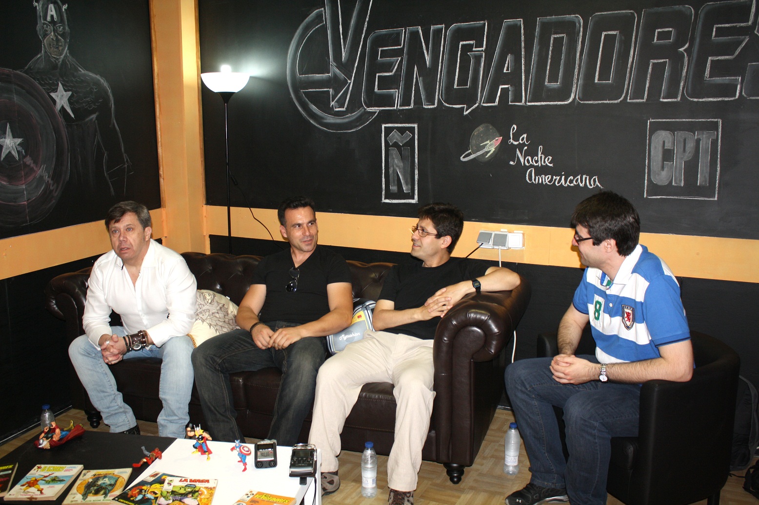 Si comenzamos el evento preguntando a nuestros invitados qué significaban para ellos los Vengadores, lo mismo habíamos hecho con algunos autores del mayor grupo de superhéroes Marvel. Conseguimos que Salvador Larroca, Mike Deodato Jr., Kurt Busiek y Steve Englehart (en perfecto castellano porque «había sido hippy en Ibiza en los 70» según dijo Pacheco), se lo mostramos a los asistentes. Y acabamos el evento con varios sorteos. Los afortunados ganadores, escogidos por las manos inocentes de Pacheco, Padilla y Clemente, se llevaron la enciclopedia que forman Vengadores. Poder en la Tierra y Vengadores. Poder absoluto, el Cabezones reunidos de Enrique Vegas y el formidable libro El viaje del superhéroe. La historia secreta de Marvel en el cine, cortesía todos ellos de Dolmen Editorial; dos ejemplares de De la estaca al martillo. Los universos cinematográficos de Joss Whedon, cedidos por Diábolo Ediciones; una lámina original de los Vengadores del primer filme de Whedon realizada en exclusiva para este evento por la ilustradora María Pizarro; reproducciones de una lámina del Capitán América realizada por Kenny Ruiz y de Iron Man a cargo de Bruno Redondo; una camiseta con motivos Vengadores cedida por TOcamisetas; y set de llaveros de Vengadores. La era de Ultrón aportados por Disney. A todos ellos les damos nuestro más sincero agradecimiento por sumarse de esta manera a nuestro Evento Vengadores. Y es que nuestro objetivo era que todo el mundo se fuera contento, y unos cuantos además con un regalo Vengador.
