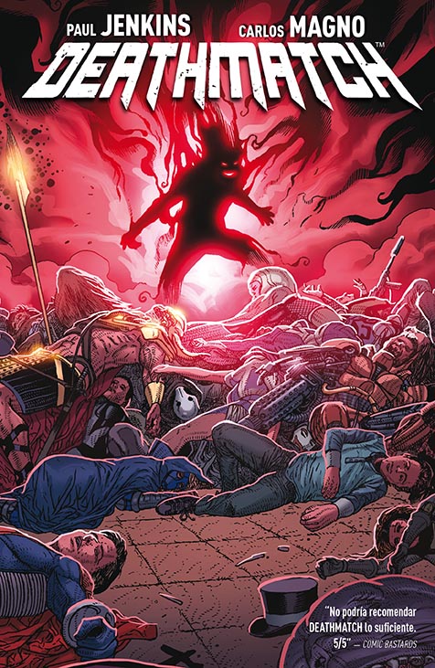 El dibujo de Carlo Magno es perfecto si lo que se está buscando es la faceta más espectacular, superheroica y de ciencia ficción del planteamiento de la serie. Los personajes funcionan visualmente con una facilidad excepcional, haciendo que el lector tenga esa familiaridad con ellos que resulta imposible por no haberlos visto antes. Los escenarios colman las fantasías que imagina Jenkins. Y las peleas, que no escatiman violencia y que aciertan a la hora de mostrar o no mostrar las muertes de los derrotados en los duelos, están a la altura de las expectativas, las del lector y probablemente también las del escritor. Quizá se le pueda poner un pero al dibujo de Magno y es que le falta algo más de emoción en los rostros para dar una mayor dimensión humana a la historia, pero hasta en eso hay pequeños momentos de redención como el que contiene la última página de la historia. Tanto el primero (aquí, su reseña) como el segundo volumen de Deathmatch (aquí, su reseña) merecían elogios porque satisfacían diversas formas de acercarse al género. Es, en realidad, una historia de las de siempre, de buenos contra malos, en la que los malos consiguen que los buenos peleen entre ellos, en escenarios espectaculares, en el marcado de una historia atractiva y, como debe de ser, con todo en juego. Pero es igualmente una historia nueva y diferente. En es mezcla es donde está el acierto de Jenkins.