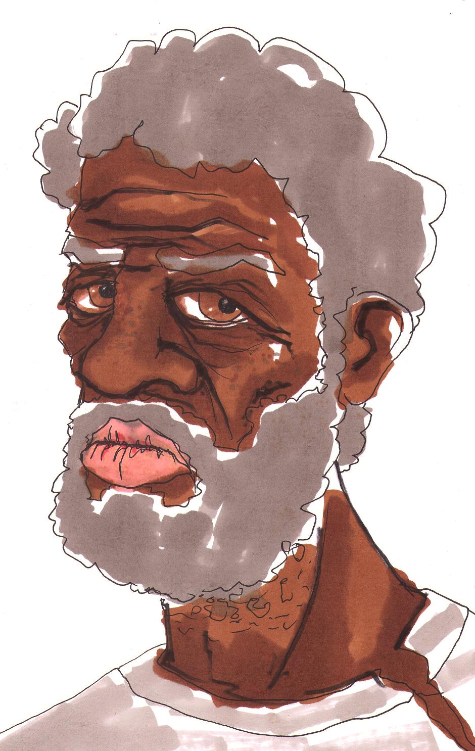 Paco: Abdel nace hará un par de años en el stand de la Facultad de Bellas Artes en el Ficzone de Granada. Estaba dibujando y probando unos rotuladores y salió ese hombre negro y canoso de rostro estropeado mirada melancólica (nota: ese boceto está incluido más abajo en esta entrevista). La opción de trabajar juntos surge una vez rechazado el proyecto totalmente mío a causa del dibujo. Como ya teníamos algún proyecto común en marcha, fue un paso natural.