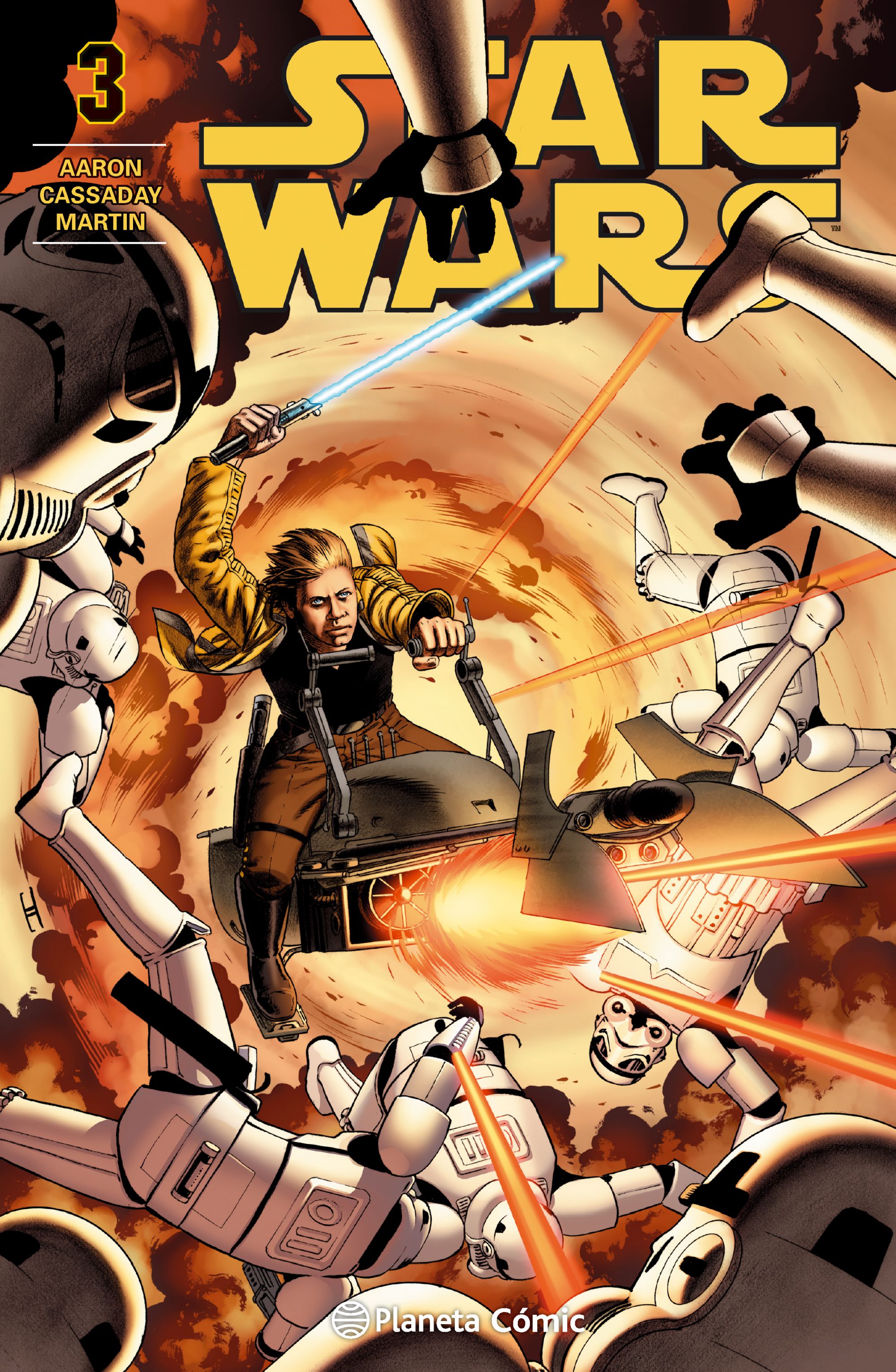 Con este tercer número de Star Wars, se acaban las presentaciones. Jason Aaron y John Cassaday se han tomado estos tres números como una bienvenida, como la forma de decirle a los lectores la forma y el tono en el que querían recuperar a los personajes clásicos, y el resultado ha sido francamente bueno. Este primer arco es, de hecho, el juguete con el que dsifrutar sin pensar en las consecuencias y es a partir de ahora, como deja bien claro el epílogo, cuando la historia se va a acercar a lo esencial. Es verdad que los tres números han formado prácticamente un clímax continuo, pero es en estas páginas finales donde todo adquiere un tinte más espectacular y descontrolado hasta formar un collage bastante interesante de las pretensiones de sus autores. Además de ir forjando un relato, lo cierto es que tanto Aaron como Cassaday demuestran que tienen ganas de dar al fan detalles con los que soñar, dando respuesta a las preguntas más salvajes que se puede hacer cualquier seguidor de la saga. Así, en este tercer número la escena que pretende satisfacer esas ansias de aficionado está bastante clara: ¿cómo derribaría Darth Vader un AT-AT? Eso es lo que ofrecen en la pieza de acción más bestial de esta entrega. Y lo mejor es que, por arriesgada que parezca cada idea que tienen, saben encajarla muy bien en la historia. Aaron ha ido diseminando a los personajes por varios lugares y consigue que todos tengan un papel bien definido, lo que le sirve para esquivar la principal trama que él mismo se había puesto en el camino.