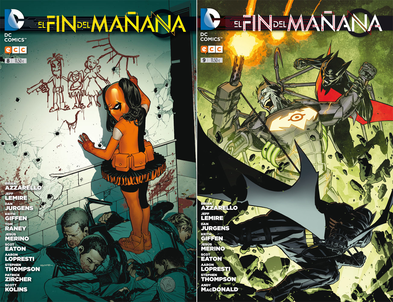 Por supuesto, El fin del mañana mantiene el baile de ilustradores que se viene mostrando desde el inicio, algo que ya se ha convertido en una costumbre en este y en otras muchas series de DC, y no necesariamente las de publicación semanal como esta. Como en anteriores números, de lo que puede presumir El fin del mañana es de que sus ocho dibujantes para diez números americanos mantienen un nivel bastante alto y una coherencia sobresaliente, lo que permite que incluso los personajes menos identificables (especialmente aquellos que aparecen sin disfraz de batalla, claro está) se puedan reconocer claramente. Sin ese trabajo, leer El fin del mañana podría haber sido un galimatías, porque habría obligado al lector a prestar más atención de la debida con cada salto de autor. Pero el nivel general es alto, la imaginación está en forma y lo que se ve es muy atractivo para la vista en todos los números que componen estas dos entregas. Puestos a destacar alguno de esos ocho nombres, las páginas que más satisfactorias resultan son las de Jesús Merino y Scot Eaton, aunque todos encuentran buenos momentos en las páginas que les tocan. De hecho, parecen estar afilando los lápices para el final de El fin del mañana, que, la verdad, se va a agradecer para redondear una historia que está pareciendo demasiado larga.