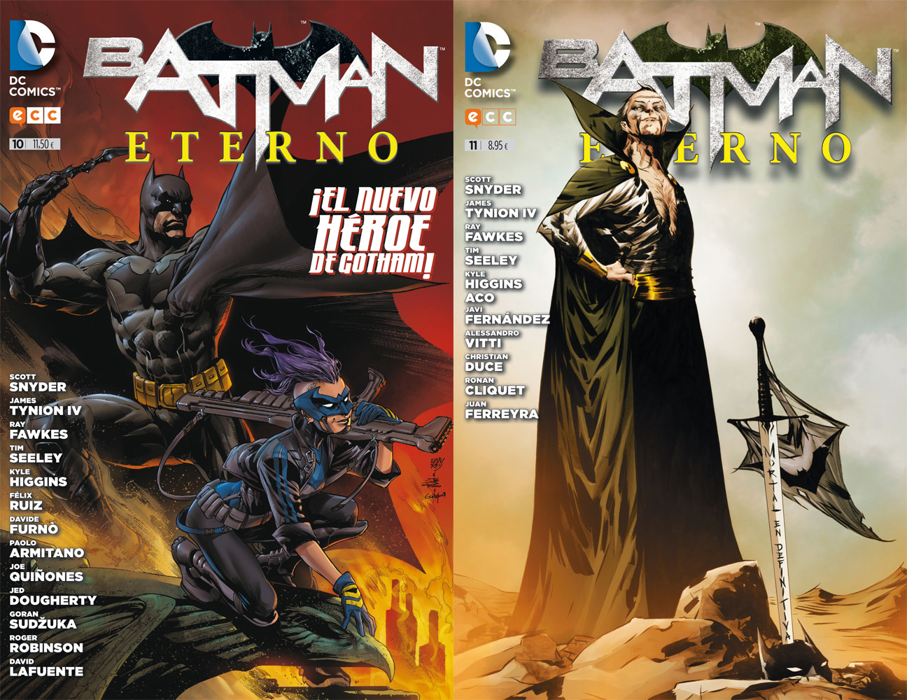 El décimo número de Batman eterno incluye los números 39 a 43 de Batman Eternal y el undécimo los números 44 a 47, publicados todos ellos originalmente por DC Comics entre diciembre de 2014 y febrero de 2015. El único contenido extra son las cubiertas originales de Tommy Lee Edwards, Ivan Reis, Ethan Van Sciver y Jae Lee.