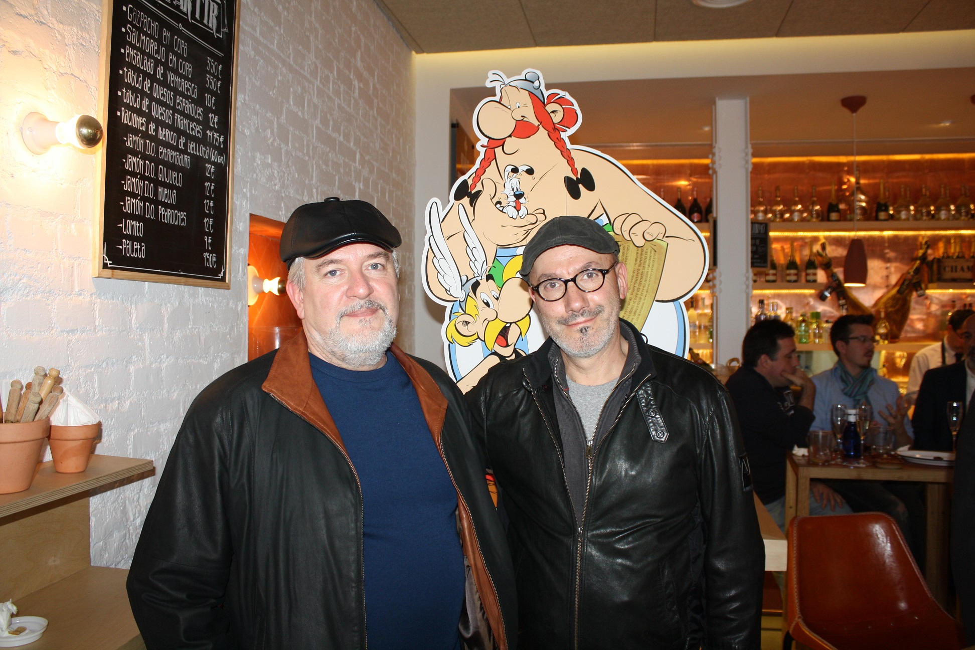 Jean-Yves Ferri y Didier Conrad encaran en Astérix. El papiro del César su segundo álbum con las aventuras de los irreductibles galos. Y como cada nuevo título de Astérix es un acontecimiento mundial, los autores están de gira por toda Europa para hablar de su nuevo trabajo. Esta semana han estado en Madrid, y gracias a Salvat, la editorial que publica estos cómics en España, han compartido su tiempo con una docena de periodistas y blogueros entre los que tuvimos la enorme fortuna de estar. La animada charla que mantuvimos con Ferri y Conrad tuvo lugar en Bocadillo de Jamón y Champán, un escenario perfecto porque su gastronomía reúne lo mejor de la comida española y de la francesa.