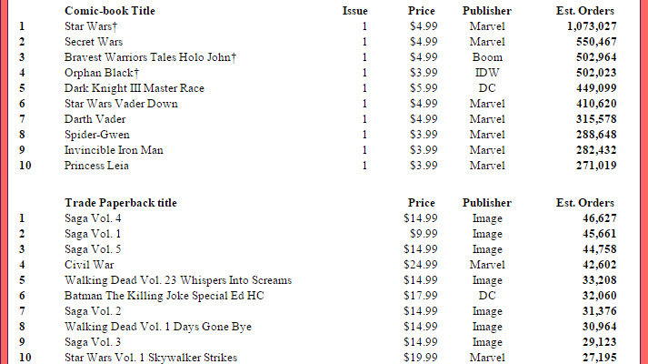 El dominio en la lista de los cómics books más vendidos del año es claramente de Marvel. No sólo tiene más de la mitad de los 1.000 títulos más vendidos de 2015, 517, sino que copa los primeros puestos de una forma abrumadora: sólo se le escapan tres posiciones de los 29 cómics más vendidos. Al brutal éxito del primer número de Star Wars hay que sumar los 550.497 ejemplares que vendió el también inicio de Secret Wars, el otro gran acontecimiento de las grandes editoriales en los últimos doce meses. A estos dos números le siguen las aportaciones de otras editoriales. La tercera posición del ránking la ocupa el primer número de Bravest Warriors: Tales from the Holo John, de Boom!, que vendió 502.964 ejemplares. El arranque de Orphan Black, de IDW, fue el cuarto tebeo más vendido, con 502.023. Y DC sólo llega a colocar su primer título en la quinta posición, el primer número de Dark Knight III: Master Race, con 449.099 unidades.