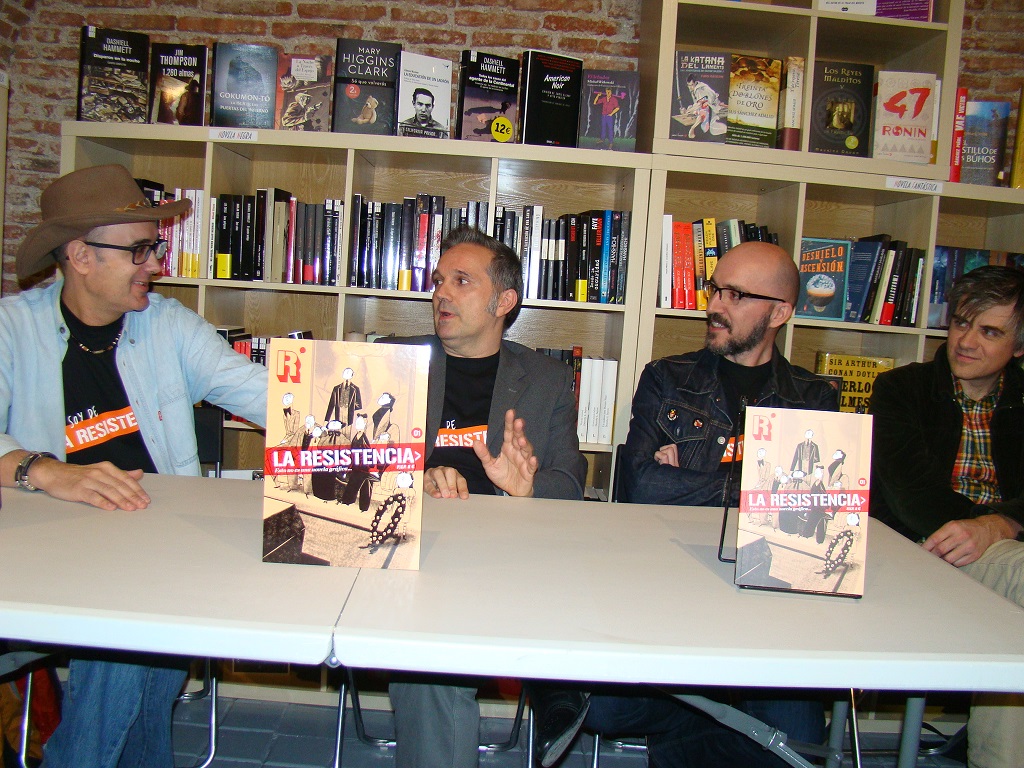 A veces da la impresión de que quien se lanza a producir y editar cómics en España es un temerario sin remedio. Cuando encima lo que se edita es una revista, formato que está semiabandonado para las viñetas, la locura parece todavía mayor. Pero ahí está La Resistencia, cuyo primer número (aquí, su reseña) ya es una realidad y una espléndida noticia para todos los amantes del cómic y de este formato. La primera presentación del proyecto tuvo lugar el pasado miércoles día 24 de febrero, en la librería madrileña La Sombra, que está en el mismo local que la sede de Dibbuks, editorial que respalda esta iniciativa. El acto contó con la presencia del coordinador de la revista, Juanjo el Rápido; el editor de Dibbuks, Ricardo Esteban; y tres de los autores que participan en el primer número, Miguel B. Núñez, Olaf Ladousse y Juan Berrio, que llegó tarde y entre risas de todos («quién pone una presentación a las siete de la tarde», dijo), y por eso no está en la foto que acompaña estas líneas.