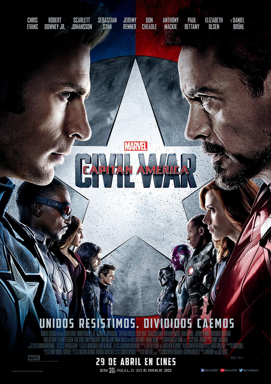 Reparto: Chris Evans, Robert Downey Jr., Scarlett Johansson, Sebastian Stan, Anthony Mackie, Don Cheadle, Jeremy Renner, Chadwick Boseman, Paul Bettany, Elizabeth Olsen, Paul Rudd, Emily VanCamp, Tom Holland, Frank Grillo, William Hurt, Daniel Brühl.