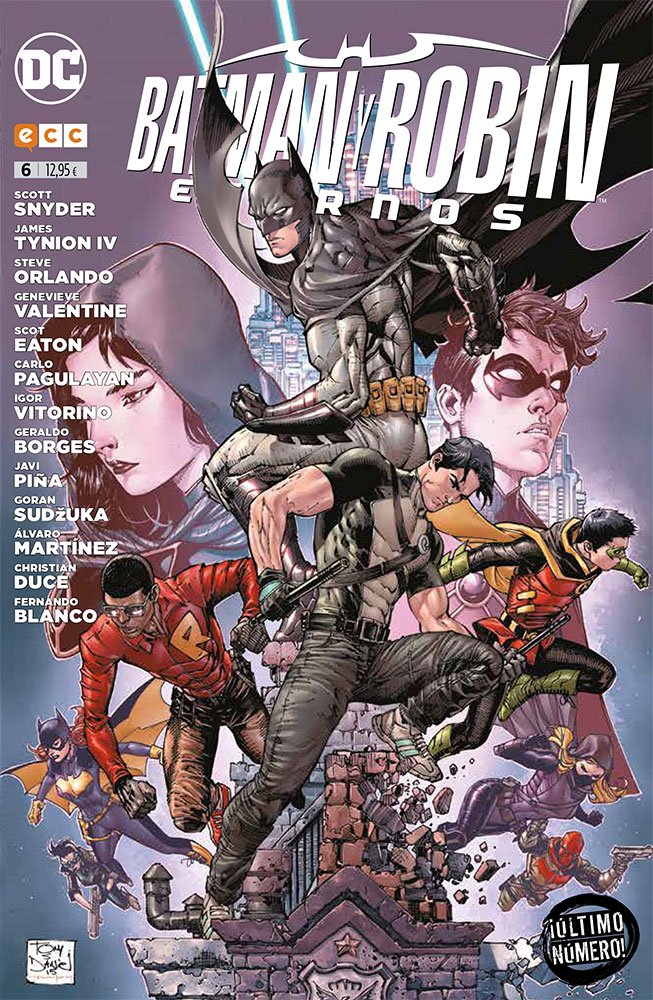 Como producto de markéting que es, y por la escasa planificación con la que las grandes editoriales siempre abordan estos inventos, la multiplicación de ilustradores sigue siendo hasta el final una de las señas de identidad de esta serie. Eso, no obstante, es algo injusto con la serie de profesionales que presta su talento a Batman y Robin eternos, porque en ello no hay nada de márketing y sí mucho de un loable esfuerzo para entretener. Los números dibujados por ejemplo por Fernando Blanco o Álvaro Martínez, o las páginas que aportan el siempre notable Goran Sudzuka son razones más que suficientes para apreciar el apartado gráfico de la serie por encima del resultado final de su historia. Batman y Robin eternos, no obstante, se cierra sin terminar de despegar y sin saber realmente si lo que se buscaba era retorcer los siempre oscuros motivos de Bruce Wayne en su cruzada, afianzar los lazos entre los diferentes Robin y demás héroes juveniles que pululan por Gotham, crear una villana que cambiara los cimientos del universo DC en lo que a la parte más centrada en Batman se refiere o simplemente dejar un relato entretenido con el que enganchar a nuevos lectores. Casi parece que lo último es lo más cercano a la realidad, aunque Snyder y Tynion IV han liado más de lo necesario la historia como para que sea la mejor puerta de entrada a los héroes de Gotham.