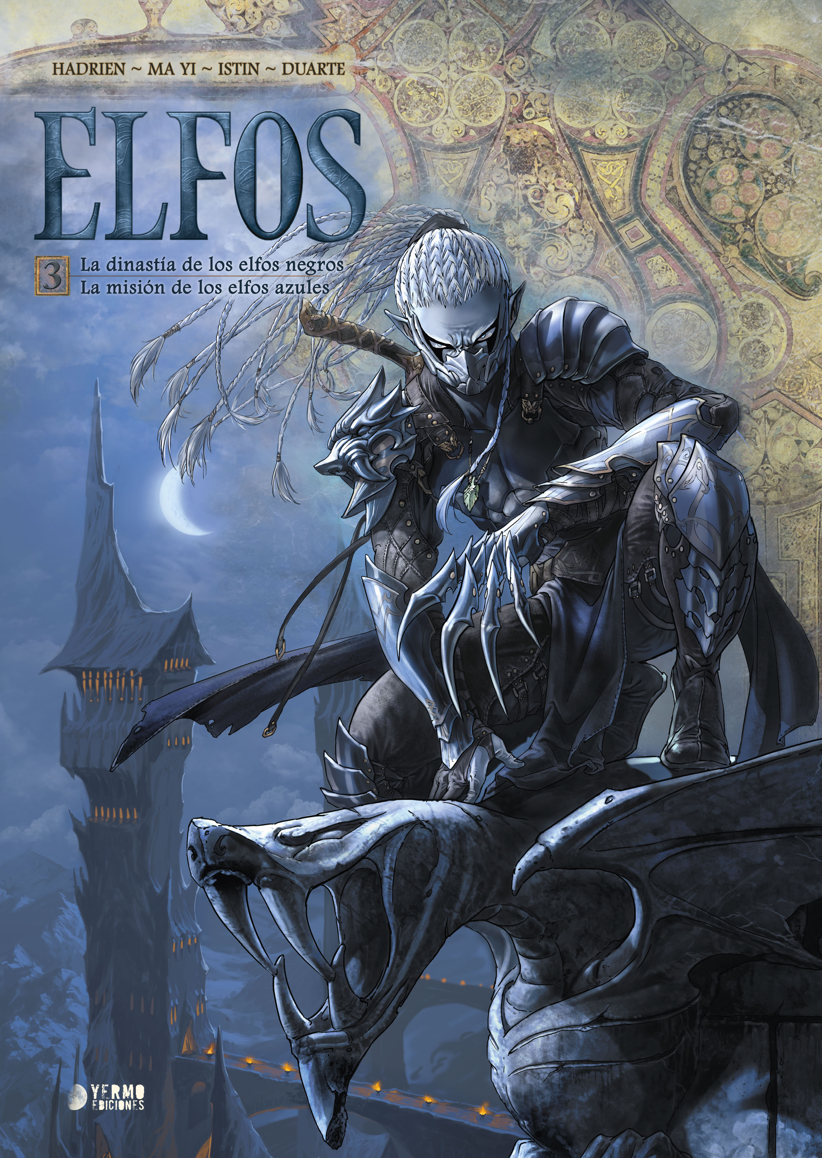 Este tercer volumen se abre con La dinastía de los elfos negros. Acostumbrados a que el elfo sea una criatura atractiva y delicada, su sugerente título es ya una razón de peso para dejarse llevar. Marc Hadrien nos conduce a terrenos oscuros, casi siempre poblados por trasgos, orcos y hechiceros en este tipo de fantasía, pero en los que coloca de manera magistral a los elfos. Dura y cruenta, la de Hadrien es una historia que convence por su tremenda oscuridad. El dibujo de Ma Yi es, en ese sentido, igualmente oscuro y espléndido. Elfos está siendo una serie que mantiene una apuesta clara en lo visual, y en la que el estilo de cada uno de los ilustradores que desfilan por sus historias parece seguir unos parámetros claros e identificables, pero cada álbum tiene sus matices. Y eso es fantástico. Porque, partiendo de una uniformidad, hay una gran personalidad. Ma Yi sabe convertir la oscuridad en un personaje más que se fusiona con la narración en cartuchos de texto que le propone Hadrien. La dinastía de los elfos negros sorprende porque los autores han sabido generar empatía en la historia de origen de un villano. Más aún, en el de una criatura que se coloca entre los arquetipos de lo más destestable de la fantasía, lo que no deja de ser la perversión de una de las razas más puras que hay dentro de este imaginario.