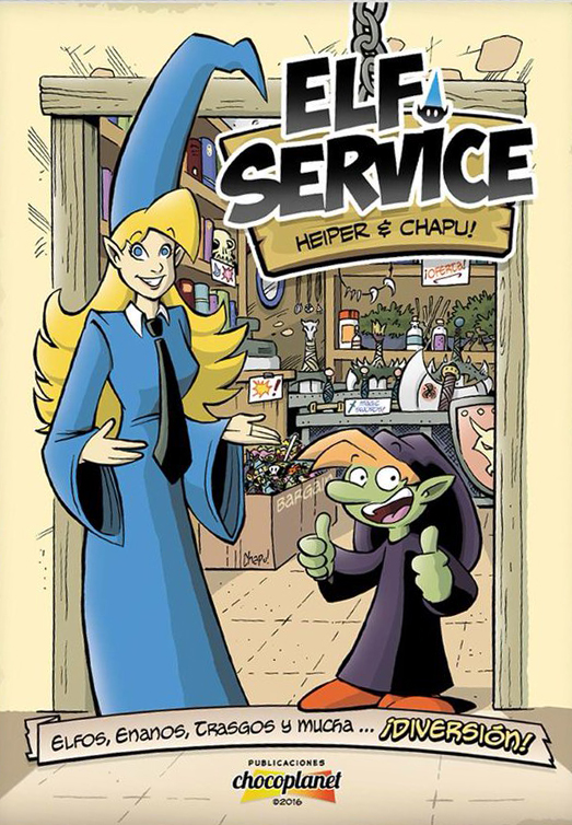 Estamos ya bastante acostumbrados a que la fantasía sea un género que acepte la parodia y el humor desde los ángulos más diferentes. El de Elf Service , aunque sea un concepto que lleva tiempo dando vueltas por el fanzine y el webcómmic y que llega así al formato impreso, tiene un espejo en el que mirarse y que, de hecho, permite comprobar la evolución de su ilustrador, Chapu. Ese modelo es La posada del Trigón (aquí, su reseña), frustrada serie en formato grapa que escribía Iván Sarnago y con la que este nueve tebeo, escrito por Heiper, se puede emparentar fácilmente. Un tebeo amable, paródico y cómico, sin demasiadas pretensiones y que sólo busca sacar la sonrisa del lector con sus gags, contenidos en historias cortas, cuatro son las que contiene este primer número, con sus referencias a la fantasía heroica y con el contraste entre sus dos protagonistas, Zhora y Chotito, una maga elfa sin experiencia que acaba descubriéndose como algo chapucera y un trasgo de buen corazón y pocas luces. Ninguno de los dos encaja entre los suyos, ese es el mejor rasgo de los personajes aunque sólo se vea con claridad en el relato de origen y se diluya después en la búsqueda de una diversión más directa en forma de sketch, y así arrancan una carrera profesional juntos para crear una tienda en la que los aventureros del mundo se nutran de equipo y armamento.
