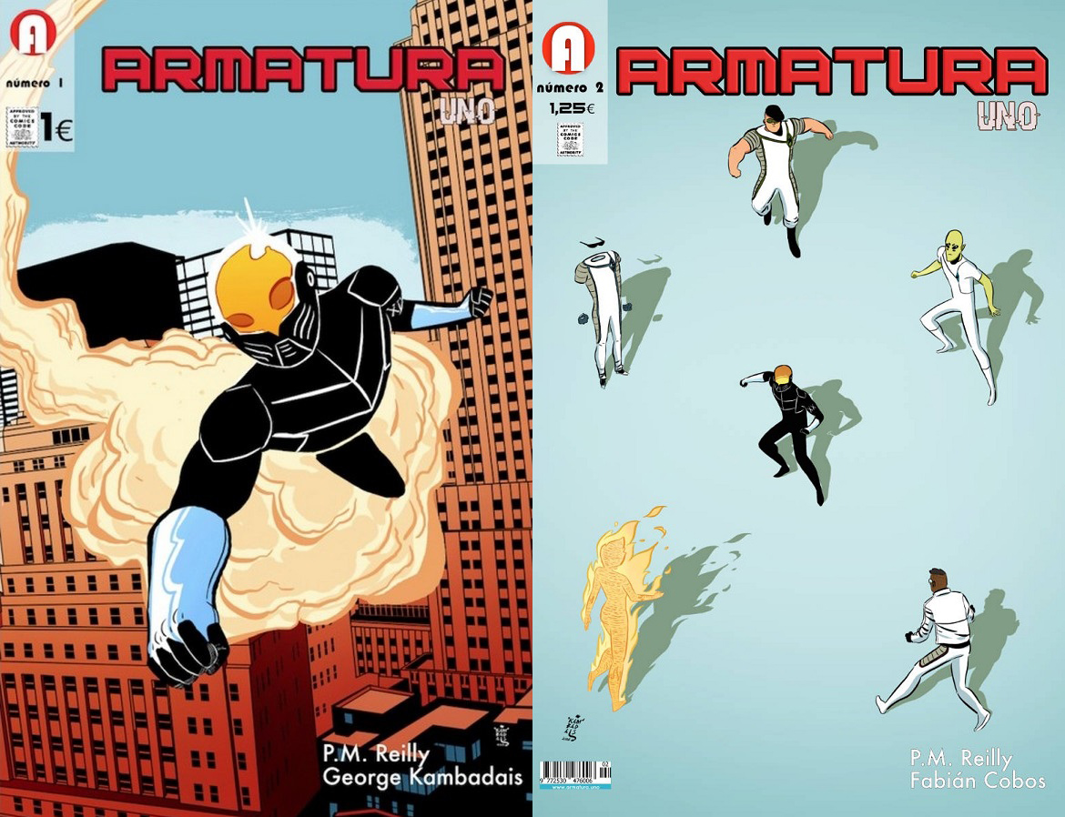 Hay un énfasis bastante notable en reivindicar una muy desconocida historia para que Armatura Uno tenga un poso relevante, y está bastante explicado en la página introductoria del primer número de esta serie escrita por P. M. Reilly y dibujada por George Kambadais y Fabián Cobos. Pero lo que viene a continuación tiene menos que ver con esa arqueología comiquera y mucho más con el tipo de cómic que Robert Kirkman nos viene ofreciendo ya desde hace algunos años. No es difícil ver trazas de Invencible (aquí, reseña de su primer número) o incluso de Tech Jacket (aquí, su reseña) en las aventuras de Billy, el chico que encuentra la armadura que da título a la serie y que le confiere unas habilidades extraordinarias para sobrevivir en un mundo que, a priori, le viene grande. Y como el propio Kirkman, en realidad, no hacía más que homenajear al cómic de superhéroes más clásico, el de la Marvel de los años 60, no es difícil asimilar el tipo de tebeo que nos ofrecen Reilly y Kambadais. Y es uno que, incluso desde esa apreciable ingenuidad que hay en todo el relato, cumple sobradamente con sus objetivos. Diversión, aventura y fantasía con un protagonista que busca una conexión inmediata con lectores jóvenes y que quiere sentar las bases de una mitología mucho más extensa que arranca siguiendo casi al pie de la letra el libro imaginario de cómo hacer un relato de origen.