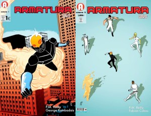 En cuanto al dibujo, el hecho de que se trate de una serie en blanco y negro sí logra marcar una diferencia con respecto a todos los precedentes mencionados. No es habitual encontrar una serie de superhéroes desprovista de color y, aunque solo sea por la novedad, hay que hablar bien del trabajo de Kambadais y de Cobos. Todo parte de un trazo sencillo, de un buen uso de los negros para que tengan un sentido narrativo (los paraguas en el entierro, las sombras en las panorámicas), e incluso el mismo diseño del personaje protagonista nace de una pretensión de esta naturaleza. La idea es que hagan falta pocos trazos para que la historia se comprenda, y en ese sentido Kambadais saca todo el partido posible a la idea. Es verdad que eso limita la espectacularidad de las por ahora todavía escasas escenas de acción, y que también implica un minimalismo en los fondos que es poco habitual en el género, pero también le da ese aire personal. Armatura Uno no llega para reinventar ni revolucionar nada, es un tebeo de género claro, sincero y accesible en el que todavía están por definir muchos elementos pero que, bien llevado y aprovechando los pasos firmes y sin locuras que ha mostrado hasta ahora, puede conseguir el hueco que busca en el saturado mercado del superhéroe, incluso asumiendo que la originalidad no es uno de sus elementos destacados.
