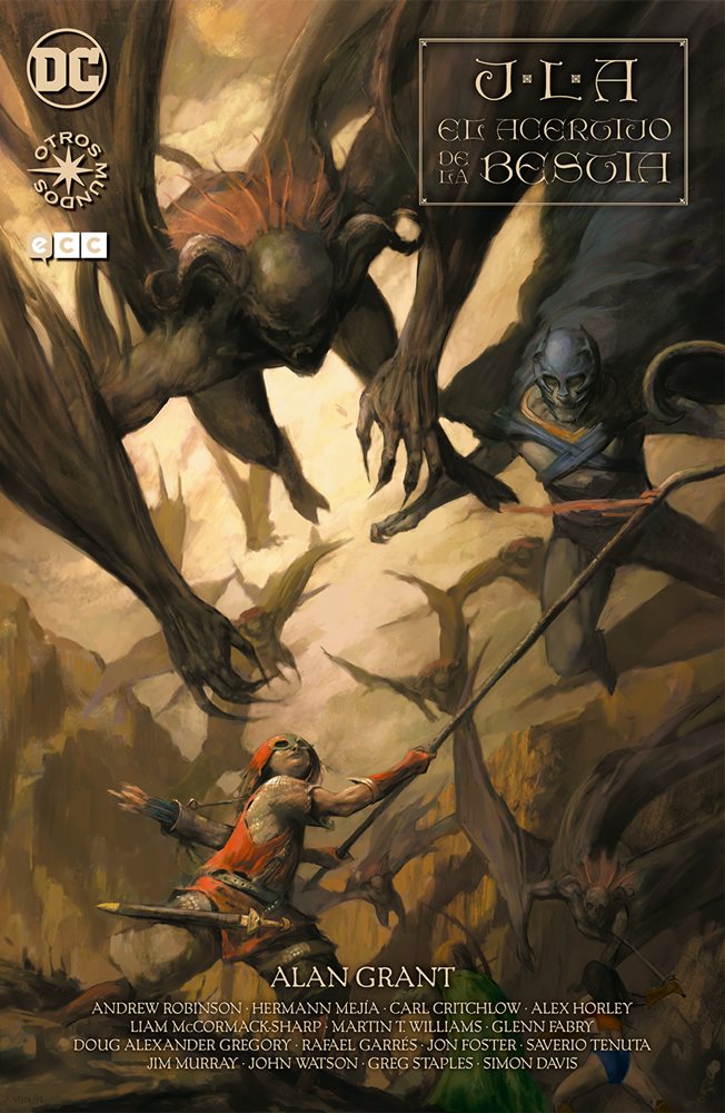 La serie de Otros Mundos tenía una premisa muy básica pero muy sugerente, llevar a los personajes del universo DC a un entorno que les fuera completamente desconocido. Su gracia reside ahí, en la traslación a ese nuevo escenario de la esencia que todos conocemos, en que las relaciones que se trazan entre los personajes sean reconocibles incluso en estos mundos extraños. Ese es el problema de JLA. El acertijo de la bestia, que Alan Grant va recolocando a los héroes y a los villanos, las ciudades y las razas, pero sin que realmente haya nada reconocible en su trazado. Están muchísimos de los personajes que conforman el universo, pero casi nada está en el sitio que cualquier aficionado les asignaría. Y eso no convierte El acertijo de la bestia en un mal tebeo, desde luego que no, porque Alan Grant traza una fantasía heroica bastante agradable, pero no es una revisión de la Liga de la Justicia como se sugiere en el título de la obra. Eso es bueno que quede claro, porque puede ser la mayor fuente de frustración al leer lo que, como está dicho, es un buen tebeo. Pero funciona mucho más y mejor si se lee sin vínculos al universo DC que en la búsqueda de guiños y referencias que propone Otros Mundos. Están, claro está, pero no son ni mucho menos lo más importante de este cómic.