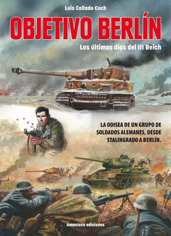 Hay un placer bastante considerable en ver un tebeo bélico dibujado por Luis Collado Coch. Es el género en el que ha venido destacando durante décadas, confirmando la fascinación que siempre produce en lectores de todas las edades el mundo de la guerra, con sus tanques y sus soldados. Objetivo Berlín es, en ese sentido, un agradable festín visual para quienes busquen rememorar otras épocas más ingenuas, en las que los niños coleccionaban efigies de vehículos blindados probablemente inconscientes de que son máquinas de matar por encima de cualquier otra cosa. Lo bueno de Objetivo Berlín es que opta por un punto de vista alejado de lo tradicional, porque pone el foco en un grupo de soldados alemanes que tratan de regresar a Berlín en los últimos días de la Segunda Guerra Mundial. Collado Coch, no obstante, no habla de nazismo. Habla solo de guerra y de supervivencia. Elude el debate sobre los buenos y los malos precisamente en una historia protagonizada por quienes normalmente son los malos. Y eso, aunque falta un trabajo mayor para perfilar a los protagonistas, bastante intercambiables, incluso impersonales, salvo en el caso del líder de este grupo, es ya por sí solo algo bastante fresco. Objetivo Berlín es un tebeo que se apoya claramente en la nostalgia y de esa manera se lee con bastante agrado.