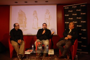 Manolo Matji y Sergio Córdoba, autores de la obra, se reunieron en FNAC Callao, en Madrid, este pasado miércoles día 18. Junto a ellos, el editor de Aleta, Joseba Basalo, ejerciendo como maestro de ceremonias. Y ante un público no por reducido menos entusiasta desmenuzaron su obra. Comenzó hablando Matji, que confesó que transformó su guion de cine original para llegar al mundo del cómic «por desesperación», porque tras muchos intentos no consiguió financiación para convertirlo en una película. «Lo dejé dormir un tiempo, pero había trabajado tanto que me daba rabia que se quedara en un cajón», explicó. Tras muchas vueltas, y una vez tomada la decisión de convertirlo en cómic, hubo un primer intento que «naufragó enseguida». Para el segundo contó con Carlos Giménez, al que Matji nunca llega a mencionar en su discurso, pero, según dijo, este le hizo «una pirula», se mostró «intratable» y no entendió el espíritu de la historia.