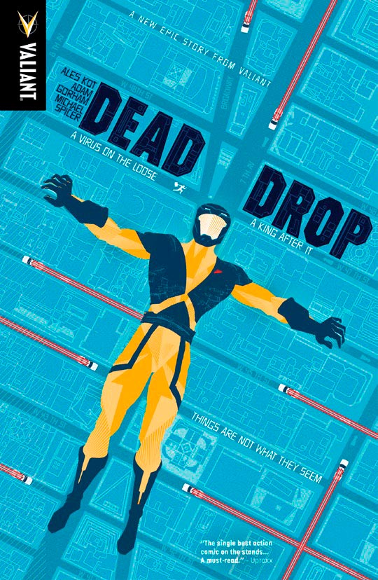 Lo que resulta evidente es que Dead Drop es uno de esos tebeos que hay que mirar desde la perspectiva del vaso medio lleno o medio vacío. Quien se sienta satisfecho con el ritmo, la acción y la cadena de acontecimientos que configuran esta huida en la que van cambiando los perseguidores, saldrá contento. Quien busque algo más, probablemente pensará que esta historia sabe a poco. Ambos grupos de lectores van a coincidir en lo que han leído, no es un cómic que provoque opiniones enconadas ni extremistas. Es fácil que todos estén de acuerdo en que lo que hace Kot es entretenimiento puro y duro. Pero viendo que no es exactamente el cómic de superhéroes tradicional y que Valiant ha sabido encontrar terrenos mucho más arriesgados que el de Dead Drop, eso puede provocar cierta desilusión. Y no sería tampoco una opinión injusta, porque cuando llegamos al final no hay un auténtico cambio en casi ninguno de los personajes que vemos desfilar. Puede que el Beta-Max sea la excepción, pero es obvio que no es lo que los americanos dirían un game-changer. Es acción y entretenimiento. Todo correcto. Todo vibrante. ¿Suficiente? Es, efectivamente, uno de esos tebeos que no tiene una respuesta única, sino que queda en manos de cada lector. Pero sí merece esa oportunidad, esa lectura y ese juicio bajo los mencionados parámetros.
