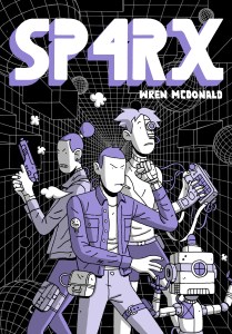 El aspecto visual de SP4RX forma parte también de su personalidad, porque siempre es divertido imaginar ciencia ficción en un bitono. Hacerlo en blanco y morado es peculiar y provoca la inmersión única en este mundo que busca McDonald. Su dibujo es sencillo, director y claro, y hasta sus casi esquemáticos rostros se ajustan bastante bien a la historia que nos quiere contar, gracias a que, puede que incluso contra todo pronóstico, su estilo se ajusta bien a la frenética acción con la que nos sirve la historia. Ese es quizá el gran obstáculo que sortea McDonald en la parte gráfica, porque lo complicado de este tipo de personajes es que se muevan con soltura en persecuciones, peleas o tiroteos, y eso lo consigue con bastante solvencia. La integración entre humanos y robots, a veces como parte del mismo personaje con implantes de todo tipo, es igualmente notable. No es fácil localizar que le falta a SP4RX para ser una obra más ambiciosa de lo que ya es, pero sí se nota algún desequilibrio en el viaje que nos propone. Lo que sí está claro es que sus páginas pasan a una velocidad vertiginosa, y esa es razón más que suficiente para recordar que esta no deja de ser la primera novela gráfica de McDonald y, por tanto, una razón sólida para tener en cuenta su nombre para un futuro en el que ojalá siga por un camino ilusionante.