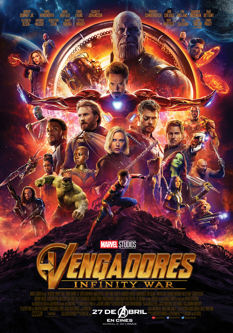 Reparto: Josh Brolin, Robert Downey Jr., Chris Hemsworth, Mark Ruffalo, Chris Evans, Scarlett Johansson, Benedict Cumberbatch, Tom Holland, Paul Bettany, Elizabeth Olsen, Anthony Mackie, Sebastian Stan, Tom Hiddleston, Idris Elba, Peter Dinklage, Benefict Wong, Chris Pratt, Zoe Saldana, Dave Bautista, Vin Diesel, Bradley Cooper, Pom Klementieff, Karen Gillan, Gwyneth Paltrow, Benicio del Toro.
