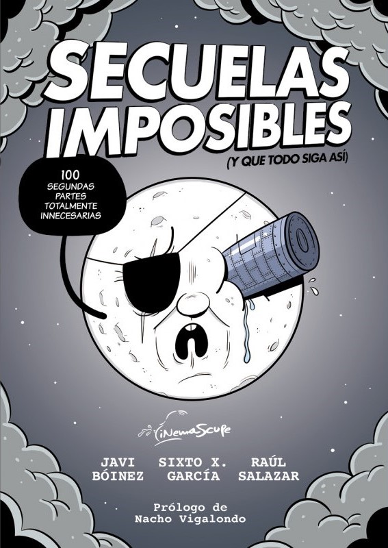 No hay mucha trampa en el título de Secuelas imposibles ni tampoco en sus dos subtitulos, Y que todo siga así y 100 segundas partes totalmente innecesarias. Lo que nos ofrecen Raúl Salazar, Javi Bóinez y Sixto X. García, los integrantes de CinemaScupe, con ilustraciones del primero, es un repaso por aquellas continuaciones que el cine, particularmente Hollywood, no se ha atrevido a ofrecernos… todavía. El repaso, eso sí, es totalmente cínico, sarcástico y humorístico. No, no es este un libro documentado sobre proyectos improbables, descartados o que se haya garantizado públicamente que jamás se harán, aunque luego esas palabras se las lleve el viento cuando un ejecutivo huele el dinero de la taquilla. Busquen la estantería de «Cine» en su librería más cercana si eso es lo que quieren leer, porque lo de CinemaScupe es hacernos reír. A veces lo hacen con un texto más o menos neutro, a veces con una teórica propuesta de guion, a veces con un diálogo imaginado. Pero la clave es que siempre hacen reír sin complejos, porque precisamente por el hecho de que abordan películas que, por ahora, no tienen secuela, pueden permitirse el lujo de decirnos lo que quieran. El límite está en sus truculentas mentes, esas que, entre otras muchas lindezas, se imaginan una cuarta parte de El padrino en clave de comedia.