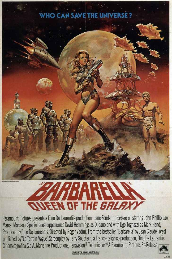 Las razones por las que una película se convierte en un éxito o por las que adquiere la categoría de culto son impredecibles. Viene esto a cuento de Barbarella, una película que podría recibir palos por tantos motivos que esa etiqueta, que sin duda tiene, puede ser difícil de justificar. Pero motivos hay, y esa es la deliciosa paradoja que consigue que nunca nos podamos poner de acuerdo sobre la categoría del cine que vemos. Siendo justos, Barbarella es una película pobremente escrita, con una historia endeble a pesar o probablemente a causa del ingente número de guionistas que pasaron por ella, dirigida con cierta torpeza por Roger Vadim e interpretada con cierta desgana, también por su protagonista, Jane Fonda, entonces pareja del director pero, curiosamente, no su primera opción para dar vida a la heroína del espacio creada por Jean-Claude Forest. Desprovista por decisión propia de toda crítica social y de todo elemento que pudiera tener segundas lecturas, aunque opciones hay de sobra, Barbarella es un delirio camp visualmente gozoso pero también una película de clarisimo corte machista, incluso para su época, y cuya única excusa real es la glorificación de la belleza de Fonda, vestida y desnuda, y su descubrimiento continuo del orgasmo en las numerosas escenas sexuales que hay en la película.
