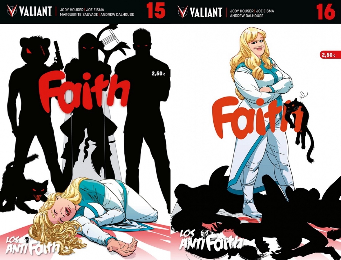 Marguerite Savage sigue generando una cohesión palpable con las páginas que añade a cada número, una constante desde que arrancó esta etapa para mostrarnos las partes imaginadas por parte de la heroína, pero no hay que quitar mérito a Joe Eisma, que es quien se hacer cargo de las páginas principales de estos últimos números y, sobre todo, de esa dinámica entre Faith y sus oponentes. Eisma domina muy bien todo lo que tiene de divertido este guion y lo hace además convirtiendo a los personajes en seres de carne y hueso. No son caricaturas, no parecen dibujos animados, da la impresión siempre de que son personas. Y eso, con el tono que quiere tener Faith, es algo impagable porque es parte de lo que hace funcionar la serie incluso es sus pasajes más rocambolescos, que más de uno hay en la manera en la que se resuelve este climax. No es mucha la acción que le toca dibujar, pero también ahí se maneja bien, y los momentos en los que Faith tiene que mantener su identidad secreta también funcionan correctamente. Faith nos sigue teniendo más que convencidos y con cada número que pasa aumenta la sensación de que es una serie que no se puede dejar pasar a la ligera y que cumple con creces con todos los propósitos que se marcó Houser desde el principio y que todos los dibujantes que han acompañado a Sauvage han entendido tan bien.