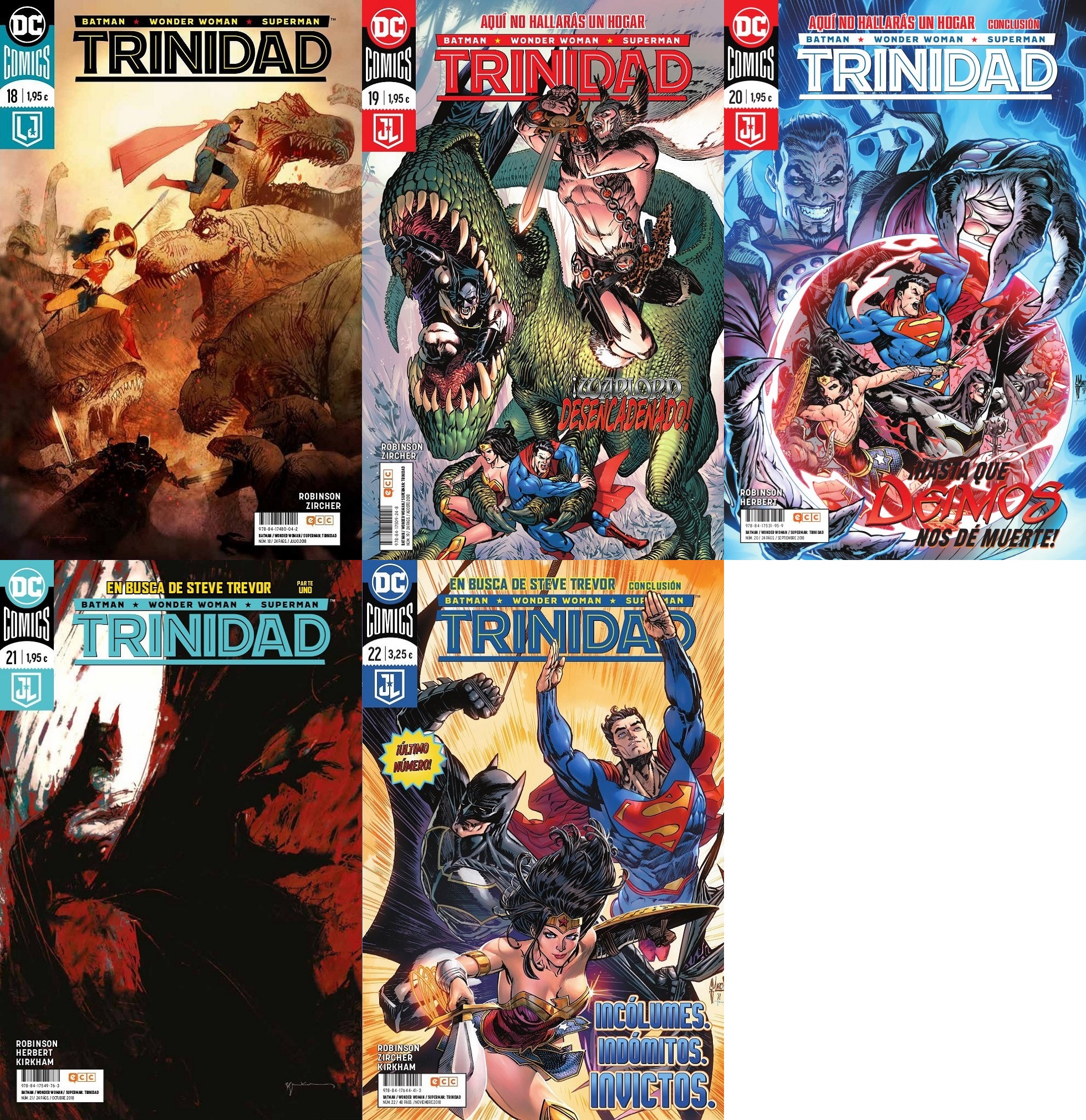 Con su final, con esta suerte de arco argumental doble con el que se da conclusión a la serie, Trinidad nos ha venido a demostrar dos cosas. Por un lado, que el enfoque de James Robinson es el correcto. Trinidad tenía que ser una serie en la que se cruzaran los destinos de Superman, Batman y Wonder Woman en historias que tuvieran un ineludible componente personal y aventurero. Es como empezó (aquí, reseña de sus primeros números) y es como se cierra, por lo que en ese sentido se acepta el adiós de buena gana. Pero, por otro lado, la serie ha sabido a poco. Es verdad que ha tenido sus momentos, pero también su indefinición, y eso que ha sido una serie finalmente bastante breve de apenas 22 números, tanto en Estados Unidos como en la edición española. En el caso de la historia final doble, la cuestión personal que hay en el núcleo del relato de Robinson es Steve Trevor. No es lo más original del mundo, y más viendo que Wonder Woman también lo utiliza, como en su momento lo hizo Liga de la Justicia, pero funciona. Y lo externo es doble. Warlord por un lado, lo que nos permite ver a los héroes en un escenario exótico, y Deimos por el otro, introduciendo la magia entre las capacidades del villano para que Superman baje un poco al mundo de los mortales y no eclipse el necesario papel principal de Wonder Woman.