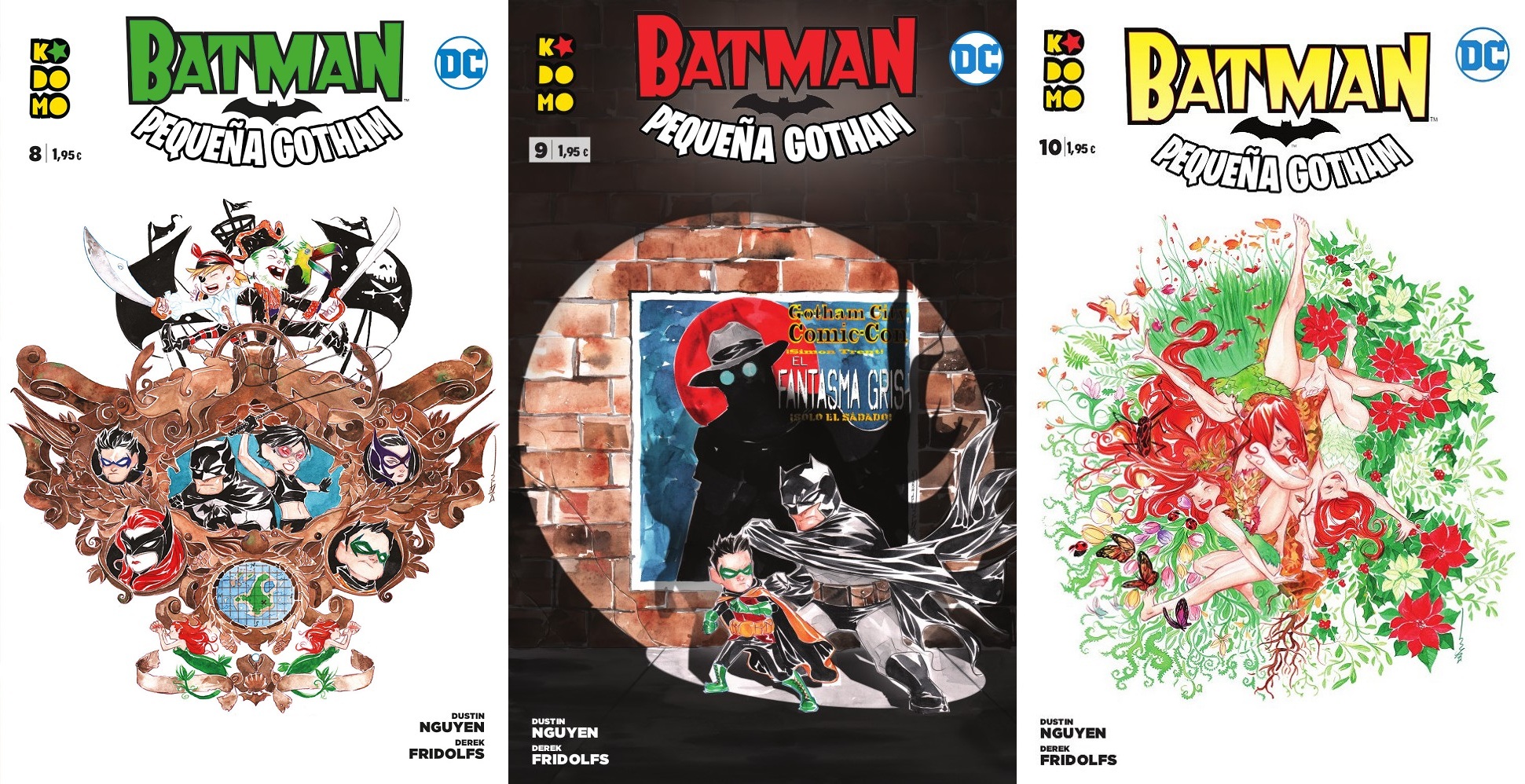 Cuanto más fácil se reconoce la festividad que se celebra, más gozosa parece la historieta de Batman. Pequeña Gotham que tenemos entre las manos. Quizá por eso hay algún que otro relato en estos tres números que parece algo menos importante que los que habíamos leído hasta este punto y pese a parecer necesarios para expandir este delicioso universo en miniatura de Dustin Nguyen y Derek Fridolfs. El caso es que, al mismo tiempo, hay otros segmentos que sí están a la altura de los mejores, como sucede por ejemplo con el primero de los del noveno número, el que nos lleva a la Cómic-Con de Gotham, un festival lleno de referencias al género y al medio, empezando por la espléndida portada que nos presenta al Fantasma Gris, a la vez un portentoso homenaje hecho en primera instancia en Batman. The Animated Series al Cruzado Enmascarado de Adam West. Este relato, como en realidad toda la serie, nos recuerda que la propuesta de Nguyen y Fridolfs es una celebración continua. Sí, es también una propuesta visualmente imaginativa y perfecta para que los más pequeños se adentren en el mundo de Batman sin miedo a encontrar truculencias o temáticas excesivamente adultas, pero eso muestra que hay muchas más lecturas posibles de Pequeña Gotham y por eso es una serie tan espléndida.