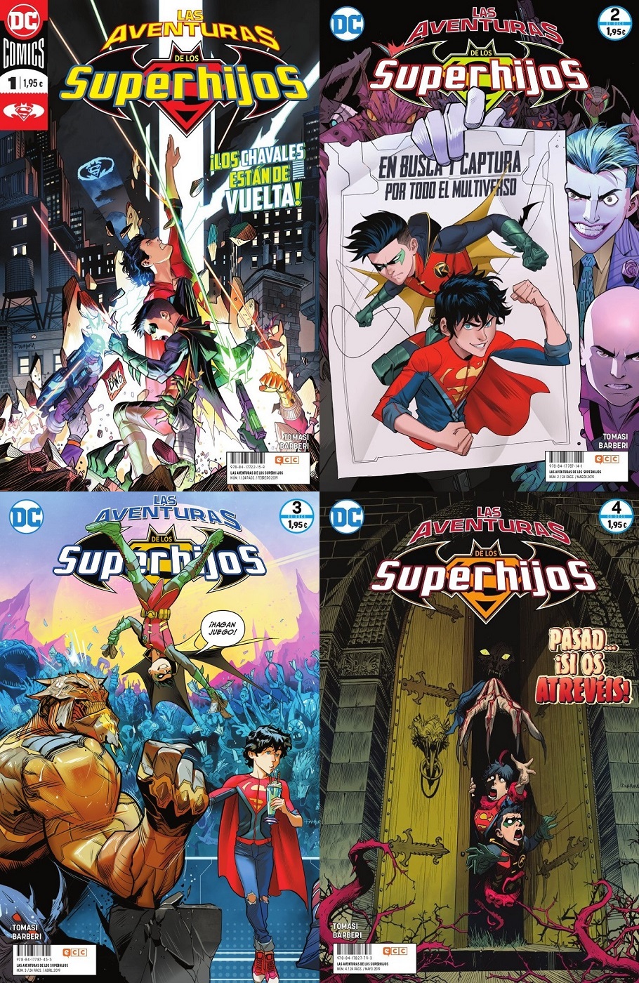 En lo visual, la dinámica entre Superboy y Robin tuvo un arranque de muy marcada personalidad visual, el de Jorge Jiménez, por lo que la mejor noticia que deja Las aventuras de los Superhijos es que no hay nada aquí que desmerezca aquella presentación. Carlo Barberi tiene versatilidad para la comedia y para la acción y no me hace falta más que ver la secuencia de apertura del primer número para tener muy claro que ambos escenarios le resultan cómodos. Los cliffhangers con los que finaliza cada episodio son oportunidades de lucimiento que Barberi no desaprovecha y que culminan el buen trabajo que hay en cada una de estas cuatro primeras entregas de la serie. Quizá el uniforme de Robin, de apariencia más pesada de lo que resulta lógico, es lo que más guerra me da al ilustrador, pero su trabajo contribuye muy bien a los objetivos de la serie. Los chavales están de vuelta, como reza el eslogan de portada del primer número, y es una buena noticia que hayan regresado como si nunca se hubieran ido. En realidad, no lo han hecho, no al menos de una manera clara para darnos tiempo a que les echemos de menos, pero no por ello vamos a alegrarnos menos de este regreso. A partir de aquí, las posibilidades son infinitas, y Tomasi y Barberi han asentado unas bases que les pueden dar para mucho en el futuro.