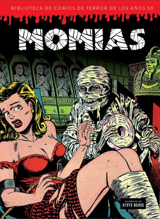 Si hay una figura del terror clásico que parece haber quedado anclada en el pasado, y no precisamente por sus características como icono, esa es la momia. La más realista de todas ellas en muchos sentidos, la que sí tiene claros referentes históricos procedentes del antiguo Egipto y de su mitología, y la que por desgracia en nuestros días ha quedado como excusa para historias de acción, aventura o incluso humor. Vampiros, hombres lobo, zombis y otras criaturas han mantenido su lugar en el horror, pero la momia no. Quizá por eso tenga un poco más valor el volumen dedicado a ellas de esta Biblioteca de cómics de terror de los años 50, porque esta vez, más que nunca, tenemos entre manos un ejercicio de nostalgia, relatos que no solo pertenecen a su tiempo sino que además han tenido muy poco reflejo en nuestros días, a diferencia de lo que, como decíamos, ha sucedido con otras figuras del género. Es verdad que la momia se presta a muchos típicos, a estructuras de guion bastante similares e incluso fácilmente repetibles, pero la selección de este libro es bastante notable y rompe cualquier tipo de posible rutina con una gran variedad de historias y de modelos, incluso prescindiendo en buena medida del tópico de la chica en apuros que se intuye muy presente gracias a la muy atractiva cubierta del volumen.