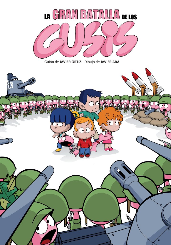 Salta a la vista que no todos los cómics son para niños, puede que en algunas ocasiones ni siquiera aquellos que tienen la etiqueta de infantil. Podemos alegrarnos y mucho de que ese no sea el caso de La gran batalla de los Gusis, un tebeo escrito por Javier Ortiz y dibujado por Javier Ara y que desborda imaginación por los cuatro costados, convirtiéndose en una lectura ideal pasa niños que sean curiosos y que vivan sus propias aventuras de juego en el día a día. Si son así en sus ratos de ocio, estos chicos lectores se van a ver muy identificados con Héctor y Estel, dos hermanos que, casi sin darse cuenta, entran en un mundo diferente en el que viven unos curiosos seres de color rosa que, entre otras rarezas, se dirigen a los niños con el apelativo de «señora» (uno solo puede imaginar las carcajadas que esto mismo habrá provocado entre escritor y dibujante durante la realización del cómic). Es evidente que Ortiz quiere mostrarnos, y lo hace de una manera muy inteligente, esa barrera que hay entre el juego de los niños y la comprensión de los adultos, con la metáfora de esa transición en blanco que se inventa Ara para este nuevo mundo y también con las conversaciones de los adultos. Y es que si algo parece claro al leer este tebeo es que, aunque lo firmen dos adultos, este es un cómic hecho por niños y para niños.