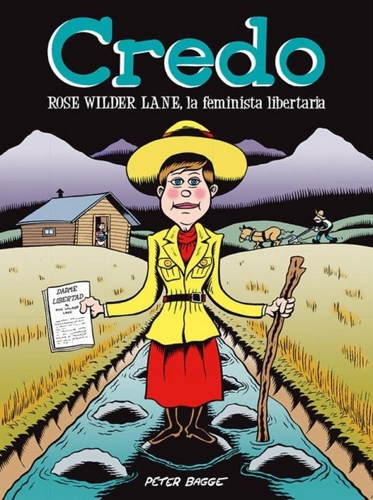 Peter Bagge lleva ya un tiempo dedicándose a llevar a la página impresa la historia de mujeres muy especiales, que tuvieron un papel importante y pionero en el desarrollo del feminismo, y cada nueva entrega no hace más que confirmar la notable capacidad que tiene el autor para mostrarnos la vida de estas personas desde un prisma muy personal, tanto por su siempre particular dibujo como por la forma en la que va enlazando momentos para convertirlos en una completísima y muy documenta biografía. Lo hizo con Margarte Sanger en La mujer rebelde (aquí, su reseña) o con Zora Neale Hurston en Fire!! (aquí, su reseña), y ahora en Credo le toca el turno a Rose Wilder Lane, la feminista libertaria. Aunque no sea, ni mucho menos, el centro de lo que nos cuenta Bagge, el nombre resultará más familiar para muchos si recordamos que, junto a su madre, fue la autora de las novelas de La casa de la pradera, que después la televisión inmortalizó. Detrás de ese mundo de ficción hay una mujer de creencias firmes, tanto que desde cierto punto de vista puede alcanzar una enorme excentricidad en su forma de ver la vida. A modo de ejemplo, Bagge logra escenas muy buenas con su pretensión de renunciar a todos los ingresos que pudieran hacer que tuviera que pagar impuestos, tal era su grado de concienciación con sus propias creencias.