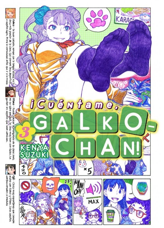 Ya son tres los volúmenes de ¡Cuéntame, Galko-Chan!, y Kenya Suzuki sigue haciendo que las historietas de sus tres jóvenes protagonistas siguen manteniendo la misma frescura y diversión del inicio. Casi se puede decir que Suzuki ha ido logrando que la serie vaya creciendo, mutando hacia algo ligeramente distinto de lo que era en el comienzo pero sin traicionar su esencia. Sigue, esto sigue siendo el camino de tres adolescentes deslenguadas que responden con sus peripecias diarias a las preguntas más extrañas y atrevidas, algunas de ellas incluso absurdas, solo entendibles seguramente desde la lógica adolescente. Pero ahora hay algo ligeramente distinto, ahora cuentan más esas protagonistas que las propias cuestiones que dan forma a este manga. Son tres libros ya, 62 capítulos. Suzuki seguramente no habría sido capaz de llegar hasta aquí si solo ofreciera respuestas llamativas a preguntas raras, y por eso hay que reconocerle que está sabiendo evolucionar a sus personajes para que adquieran la misma importancia que esas cuestiones. Hay un proceso, un viaje, una continuidad, y todo mantiene la simpática clave adolescente que da forma a estas aventuras y es divertido ver lo desinhibidamente que trata temas de lo más dispar, también por supuesto cuestiones de índole sexual, pero ni mucho menos solo dentro de ese terreno.