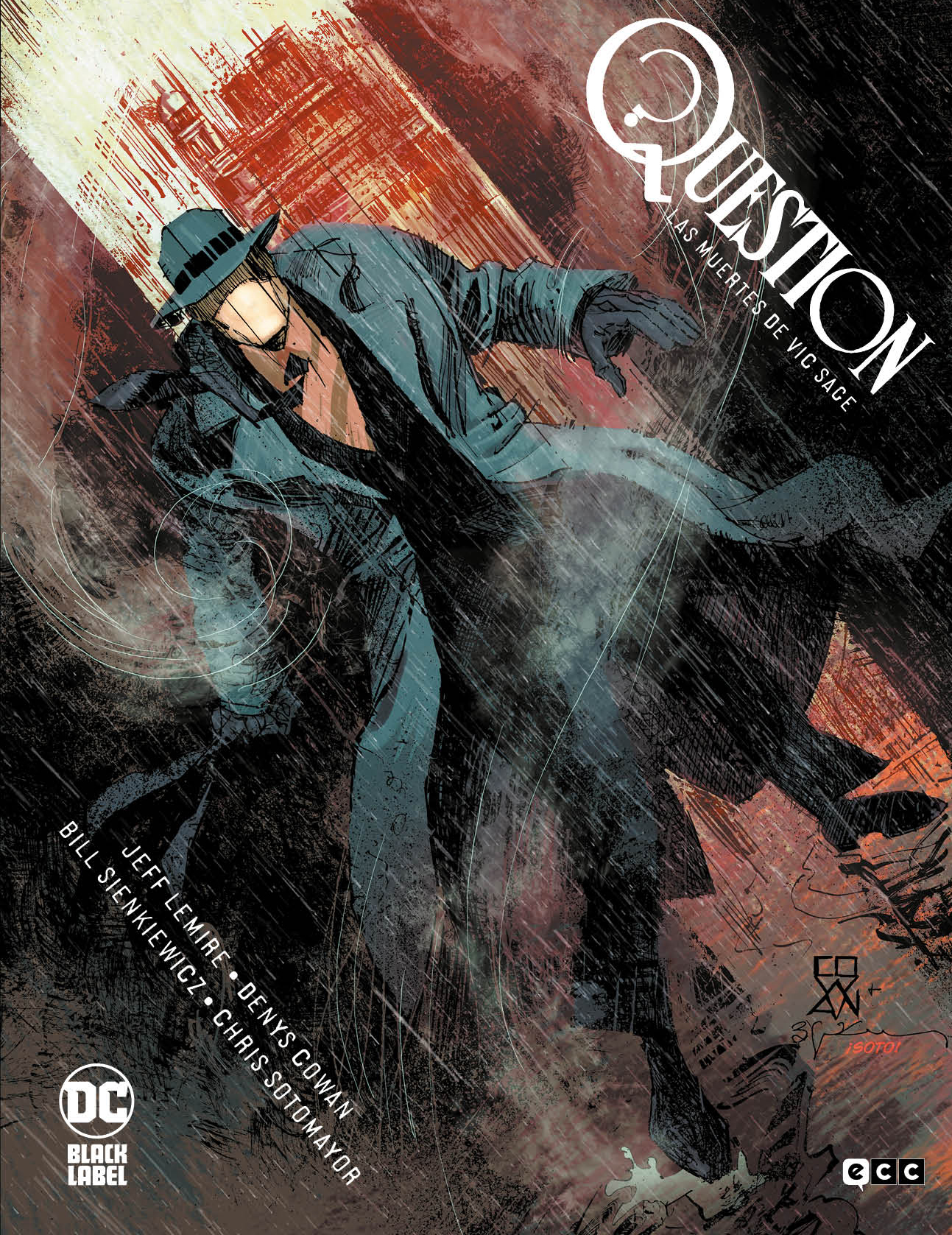 Cowan, además, es un ilustrador fascinante en todo momento. Sabe interpretar al Question más urbano pero también al más clásico y fantástico. Domina el entorno callejero y realista, la violencia que está al alcance de la mano, pero al mismo tiempo consigue hacer creíble ese viaje espiritual y psicológico que nos propone Lemire. Las tintas de Sienkiewicz, de las que ya henos hablado, potencian todavía más los aspectos más pronunciados del dibujo de Cowan. En lo que no hay ningún género de duda es en que su versión de Question, independientemente de la época de la que hablemos, es sobresaliente y digna de colarse entre las más notables de la historia del personaje. Las muertes de Vic Sage se convierte así en una experiencia que nos lleva a otra época, porque el suyo no es precisamente un dibujo convencional, los negros, las tintas y el aspecto desdibujado que le da a muchas secuencias, incluso al retrato de los personajes, contribuye a que la atmósfera sea todavía más intensa. No es fácil decir si este es el cómic que necesitaba Question para llegar a un público actual, pero desde luego es un intento sincero y loable, a la altura de sus creadores y también de su protagonista. Y desde luego no da la sensación en ningún momento de que se agote en una primera lectura, síntoma de que Lemire y Cowan han sabido encontrar algo original.