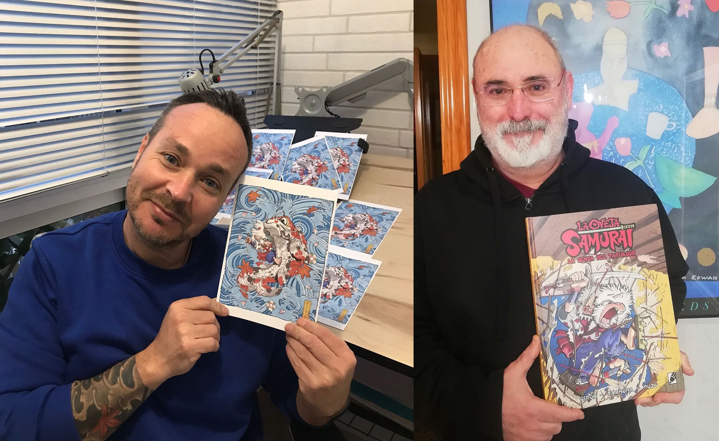 Nos lo hemos pasado en grande con La oveja samurái. La senda del tatuador (aquí, su reseña), la obra con la que Santiago Girón y Fran Carmona nos han presentado su divertidísimo universo de animales antropomórficos en el Japón feudal, y por esa misma razón no podíamos dejar de hablar con ellos para que nos contaran la experiencia. ¿Y sabéis qué? Entrevistarles es casi tan divertido como leer los tebeos que hacen. Fran a la izquierda y Santiago a la derecha, por cierto, pero podrían estar al revés. O uno arriba y otro abajo. Que sí, que son así de divertidos, cuando trabajan y cuando hablan.