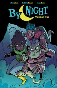 Es curioso, y lo hemos dicho en anteriores entregas de By Night, como también en Giant Days, que las series de Allison sean capaces de ofrecer una unidad visual de lo más singular cuando están firmadas por ilustradores distintos. Pero es que quien haya disfrutado de Giant Days intuye irremediablemente que By Night es puro Allison. Eso es un mérito de Christine Larsen que, por cierto, no minimiza los méritos que le debemos atribuir a su trabajo. De hecho no es descabellado decir que alcanza en este volumen final su mejor resultado, en parte también porque Allison le brinda aquí los elementos más interesantes dentro de todas las vertientes de la serie. El tono documental cinematográfico del inicio, la épica que se esconde en la historia de ese otro mundo y el cinismo más absoluto que tiene la parte de nuestra realidad y la forma en la que se resuelve esa parte de la trama cobran vida gracias a Larsen. Su estilo de caricatura ayuda, pero también sirve de caballo de Troya para quienes esperen una sencilla comedia juvenil, porque lo es en menor medida de lo que algunos esperarán. Y eso es porque sabe sorprender. Como la misma historia de By Night, que juega dentro de su propia diversión para que sintamos su originalidad aún sabiendo que bebe de muchas fuentes. Es simpática, eficaz y está muy bien dibujada, poco más se le puede pedir.