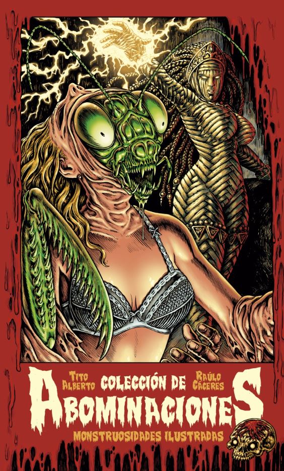 Hubo un tiempo, en esos añorados y nostálgicos años 80, en los que era relativamente fácil y sobre todo emocionante acceder a contenidos que no eran los más adecuados para niños de corta edad. Entonces había libros y colecciones de cromos que tenían ilustraciones que eran herederas directas del cómic de terror de los años 50, ese que en Estados Unidos inició una caza de brujas en el medio, al que se culpabilizaba de todos los males de la sociedad. Si hay que hablar de un referente a Colección de abominaciones, ese puede ser fácilmente el que estamos buscando, porque el libro de Tito Alberto y Raúlo Cáceres es justo eso, una colección de imágenes de criaturas, monstruos y fantasmas con los que alterar el sueño de los más pequeños… aunque ahora sean más bien adultos los que se asomen a esta galería de horrores. El espíritu, en todo caso, es el mismo, el de los cromos de toda la vida, el que nos permitía ver una imagen fija y una pequeña explicación para que nuestra imaginación se disparara a la hora de crear incontables historias con esos mismos personajes que nos impresionaban con un solo vistazo. Y si en el álbum de cromos la gracia era ir reuniendo toda la colección poco a poco, aquí lo bueno es que la tenemos toda a nuestra disposición desde el mismo momento en el que el libro cae en nuestras manos.