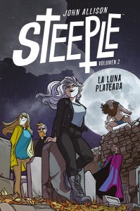 Los personajes de John Allison nunca dan la sensación de estar agotados, ni siquiera aquellos que a priori protagonizan historias cerradas como pasaba con Steeple (aquí, reseña de su primer volumen. Por eso se acepta como normal que el creador de Giant Days (aquí, reseña de su primer volumen), sin duda su obra más popular y extensa, haya decidido seguir explorando el universo de Steeple, creado como autor completo, y que lo haga además profundizando en el tono más exagerado que pueda tener la serie, ya de por sí con una premisa rocambolesca. La Luna plateada no es tanto una secuela, en tanto que la historia original sí quedaba bien cerrada, como un nuevo acercamiento a sus protagonistas, a lo que podría sucederles a continuación, con una nueva aventura que hable de ellas y de su entorno. Y con el cinismo que hay en este universo, claro, en el que la fe y sus manifestaciones tienen un valor muy importante, tanto como la arrolladora personalidad de sus principales elementos. Con estos mimbres, y con Allison ya desatado tras haber conseguido completar la primera historia, parece evidente que en esta segunda parte todo lo que llamaba la atención en la presentación de Steeple sigue muy presente en esta prolongación, y eso se agradece, que el autor siga fiel a lo que le apetece contar.