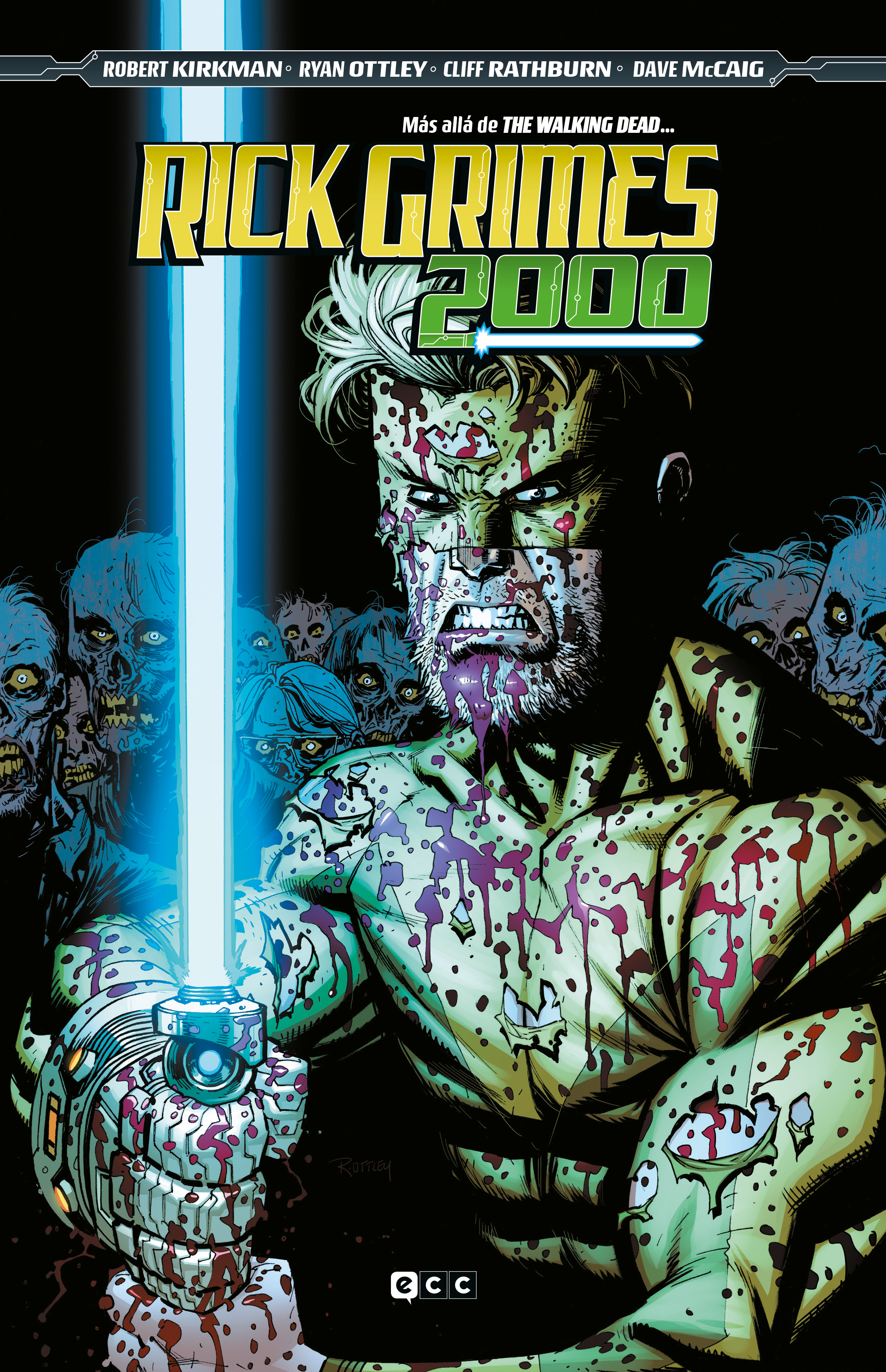 Para Kirkman, Rick Grimes 2000 es además la oportunidad de que Ryan Ottley, el ilustrador de Invencible (aquí, reseña de su primer volumen), la otra gran creación del escritor, se meta en este otro universo que tan poco tiene que ver con el que ha llevado a la excelencia. Obviamente, el escenario es más propicio para que Ottley desarrolle lo que más le puede gustar, mejor que el de Los muertos vivientes originales, que se prestan mucho más al terror que a la acción. Y el resultado es tan entretenido como podría esperarse, un espectáculo de luces, colores y explosiones, de diseños locos y especiales, de esos que difícilmente tendrían hueco en Los muertos vivientes pero sí en Invencible. La mezcla es tan bizarra, insistimos en el término en su más amplia acepción, que no cuesta nada aceptarla como lo que es, una de esas rarezas que evidencian la buena forma en la que se encuentra una franquicia de tantísimo éxito. Una de zombis con el marco de space opera, o una de ciencia ficción con personajes conocidos y con algún muerto vivientes que aderece la presencia de alienígenas, cada cual que lo vea como quiera, pero lo que resulta evidente es que no se pasa nada mal con esta soberana locura. Parece difícil que esto tenga continuidad, pero ¿quién se atrevería a decir que Kirkman no sería capaz de seguir adelante con miles de sorpresas por delante?