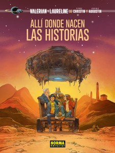 Más que extraño, resulta simpático que haya sensaciones así en una historia que forma parte de una larga tradición pero que muchos también entenderán como lo que realmente es, algo distinto. Aunque sea lo mismo, no es exactamente como lo que se intenta en Una historia de Spirou por… porque se asume que Allí donde nace las historias podría estar dentro de continuidad de alguna manera, pero a la vez sí desprende emociones bastante análogas a las de ese sello que de hecho comparte desde su propia serie. Como allí, y aunque sea en papeles algo distintos, se reconoce bien a los héroes, Valerian y Laureline. El fondo, como por otra parte es habitual, se convierte en un personaje más, y la búsqueda en el siglo XXI del preciado metaloide que en el siglo XXVIII sirve para dar energía a las inteligencias artificiales que construyen los relatos más imaginativos se erige en una excusa apreciable para la aventura que se desarrolla. Y se acepta con bastante naturalidad que Valerian y Laureline son casi secundarios en muchos momentos del álbum, porque son parte natural de una historia que se construye dando una personalidad notable a todos los que se asoman a ella en algún momento. Con poca acción, lo que puede llegar a sorprender, consigue en todo caso que el ritmo de lectura sea alto.