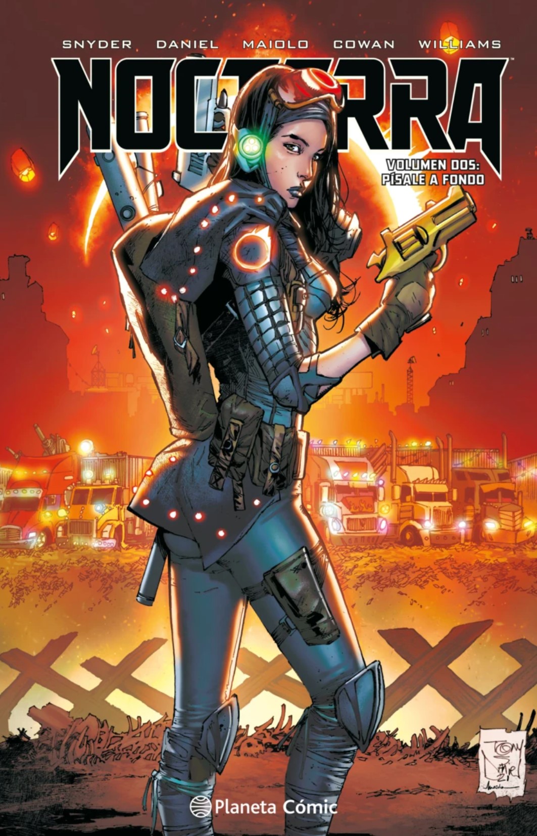 Hay algo en Nocterra que nos recuerda a aquellas series y personajes que nacieron en los años 90, fruto del descontento de ilustradores que se sentían maltratados por las grandes editoriales y decidieron probar suerte por su cuenta. Seguro que si le preguntáramos a Scott Snyder y Tony S. Daniel confesarían que sus intenciones van por ahí. O quizá no, pero desde luego es algo que es fácil sentir también a este otro lado de la página. Lo que llama la atención es que su vehículo de acción desbocada, que eso es lo que se intuye en el diseño y en la misma historia de Nocterra no es en realidad un relato con tanta adrenalina visible. La tensión está ahí, desde luego, presente casi en cada página, pero es una historia muy dialogada. Es como si Nocterra tuviera más interés en mostrar a los personajes por lo que piensen, por lo que pretenden y por sus recelos que por lo que efectivamente pueden hacer en este mundo sin luz y plagado de criaturas amenazadoras. Y el caso es que sirve. No es probablemente el cómic noventero que podemos imaginar por la cubierta, pero se lee con mucho agrado. El primer arco argumental (aquí, su reseña) fue una buena presentación, este segundo, Písale a fondo amplía un poco más su universo y se presta a un final que descoloca a conciencia. Y se agradece, la verdad.