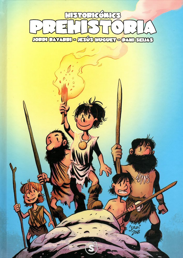 Llevamos mucho tiempo alabando la labor educativa que Jordi Bayarri lleva haciendo con sus cómics durante años, y de la misma manera que seguiremos aplaudiendo lo que haga en los formatos ya conocidos podremos alegrarnos de que abra nuevos caminos. Historicómics es el más reciente, una serie de libros que arranca con Prehistoria y con la que quiere acercar a los más pequeños lectores a aspectos de la historia que tienen que conocer, pero desde un punto de vista y un uso del lenguaje más actual. En este primer libro habla del descubrimiento del fuego, de las primeras pinturas rupestres y de cómo el hombre ideó la rueda, pero no lo hace desde un punto de vista de fidelidad histórica absoluta. Ni siquiera en su Colección Científicos se resistía a hacer actuales a sus personajes, pero en Historicómics la idea es otra, es la de contar estas historias como si fueran cuentos actuales, como si fueran lo que son: tebeos divertidos para niños de los que se pueden extraer lecciones históricas que les servirán cuando se sienten frente a sus libros de texto. Y esa labor, cuando se hace además con cariño, tiene que ser reconocida de manera entusiasta, porque anima a leer cómics con un sentido tan práctico como de entretenimiento. Es decir, los mismos conceptos que en la Colección Científicos, pero con sus diferencias.