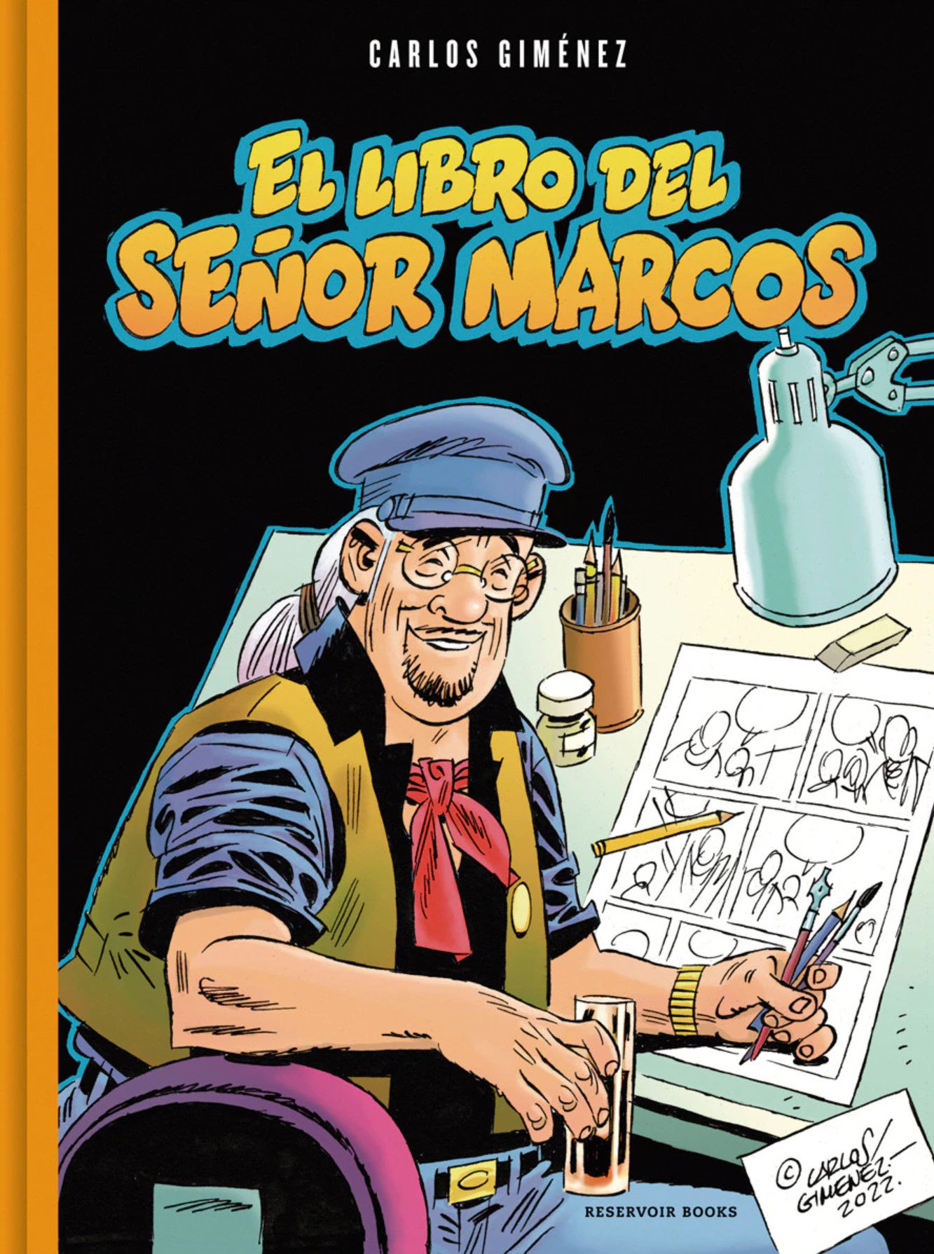 En los últimos años estamos asistiendo a una etapa tremendamente prolífica en la carrera de Carlos Giménez, y eso es algo por lo que debemos felicitarnos (y felicitar al autor, por supuesto), porque su importancia en el cómic español es mayúscula y cualquier título que lleve su firma es a priori llamativo. Con El libro del señor Marcos, además, nos adentramos en terrenos desconocidos, por mucho que se trate del colofón a una de sus series más conocidas, Los profesionales, donde se creó un alter ego para hablarnos de su experiencia dentro del mundo del cómic en los años 80 y, por extensión, de la propia sociedad en la que vivió aquella aventura profesional. La novedad está en que El libro del señor Marcos no es cómic, sino prosa, y que este que tenemos en las manos no es un tebeo, sino un libro ilustrado, en el que Giménez escribe y a la vez brinda una ilustración y una letra capital inicial a cada uno de los relatos que hay en el volumen. Si vemos las fechas de las ilustraciones a toda página, comprobaremos que las realizó entre 2020 y 2022, por lo que es lícito pensar que esta es una idea nacida de la pandemia y que fue completando hasta darle forma y llegar al momento actual. O dicho de otra forma, es un proyecto forjado con pausa y, se ve, con mimo. No es un cómic, saca al lector del escenario de confort a su lector habitual, pero es Los profesionales.